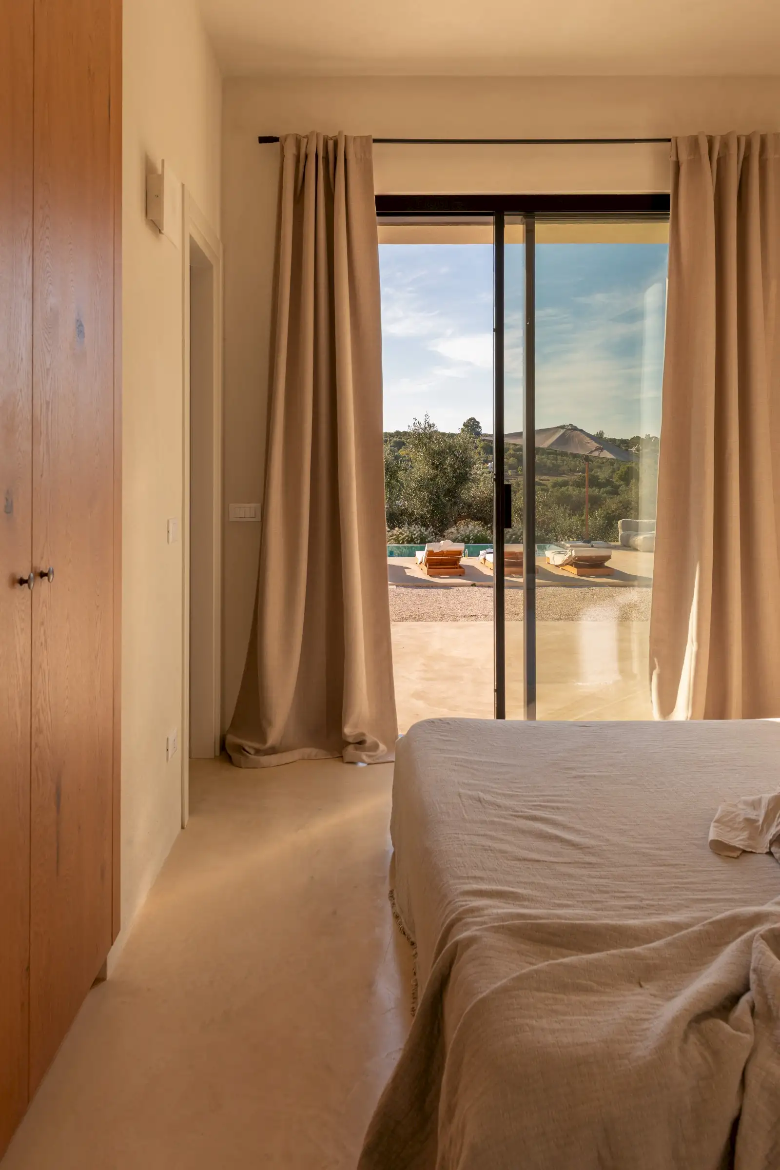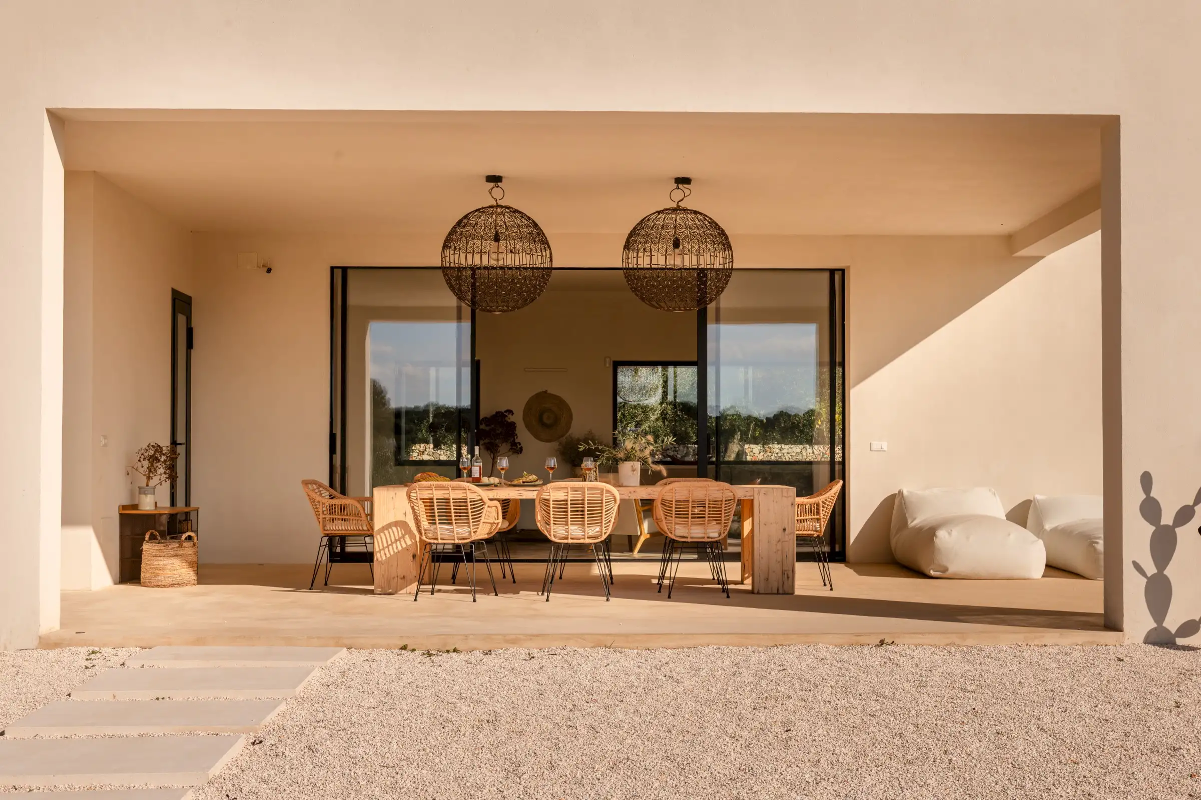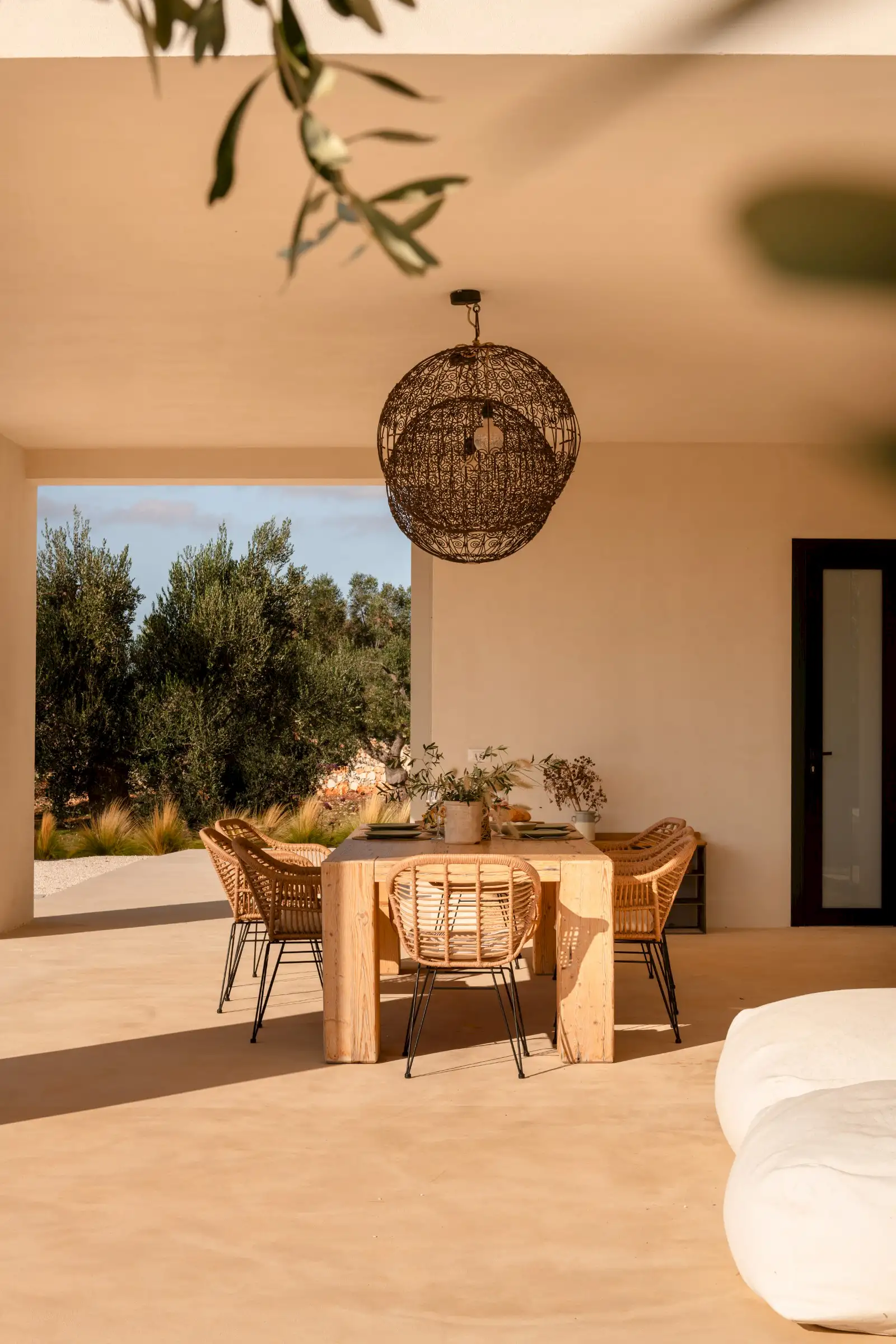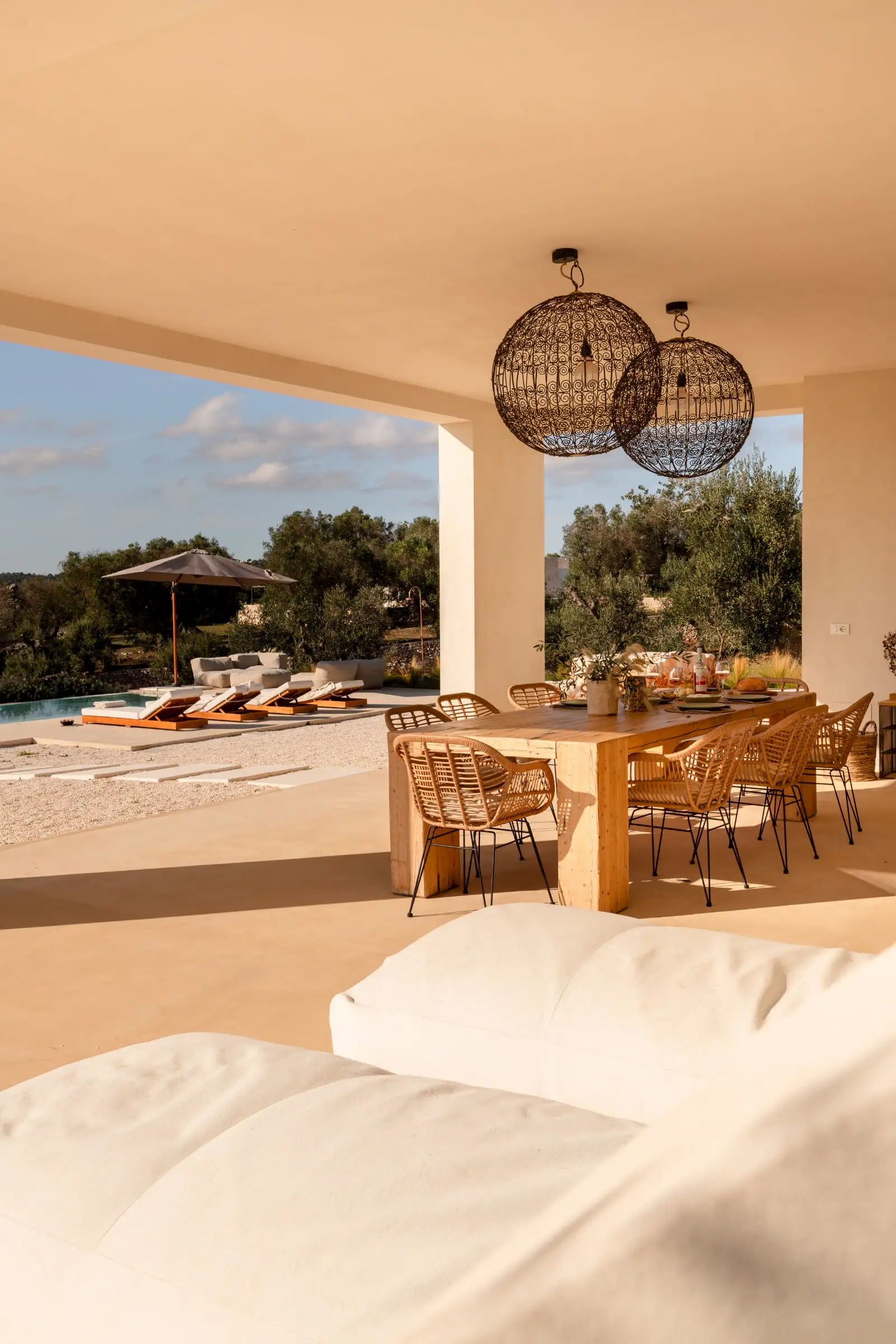 A big, solid wooden table on the veranda is the ideal dining spot with views across the pool from one side or through the house to the olive groves beyond from the other.