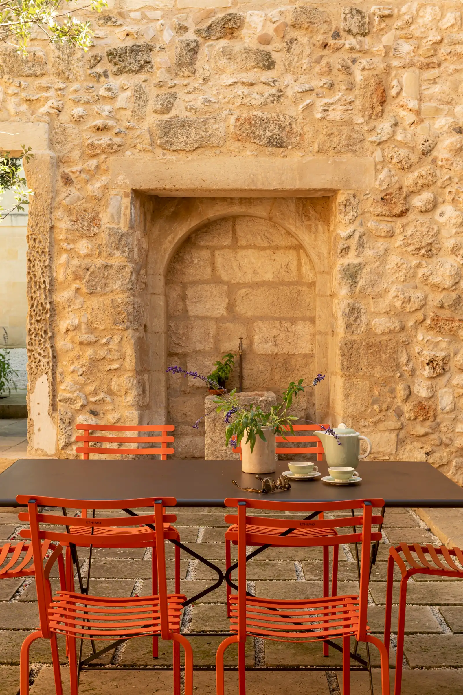 There are three spacious doubles and one twin – all with soaring star-vaulted ceilings and en-suite shower rooms. Then there are the outside spaces: a ground-floor courtyard, a first-floor plunge pool and sun terrace and, finally, a rooftop terrace with built-in sofas, a small kitchen, a large stone dining table and beautiful views over the town’s ancient rooftops.