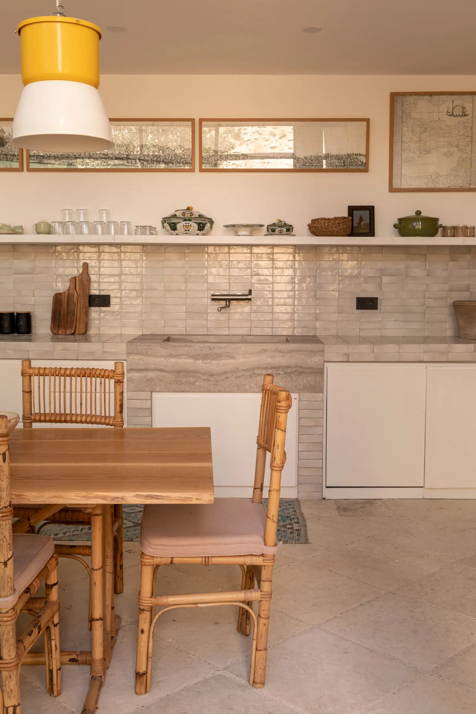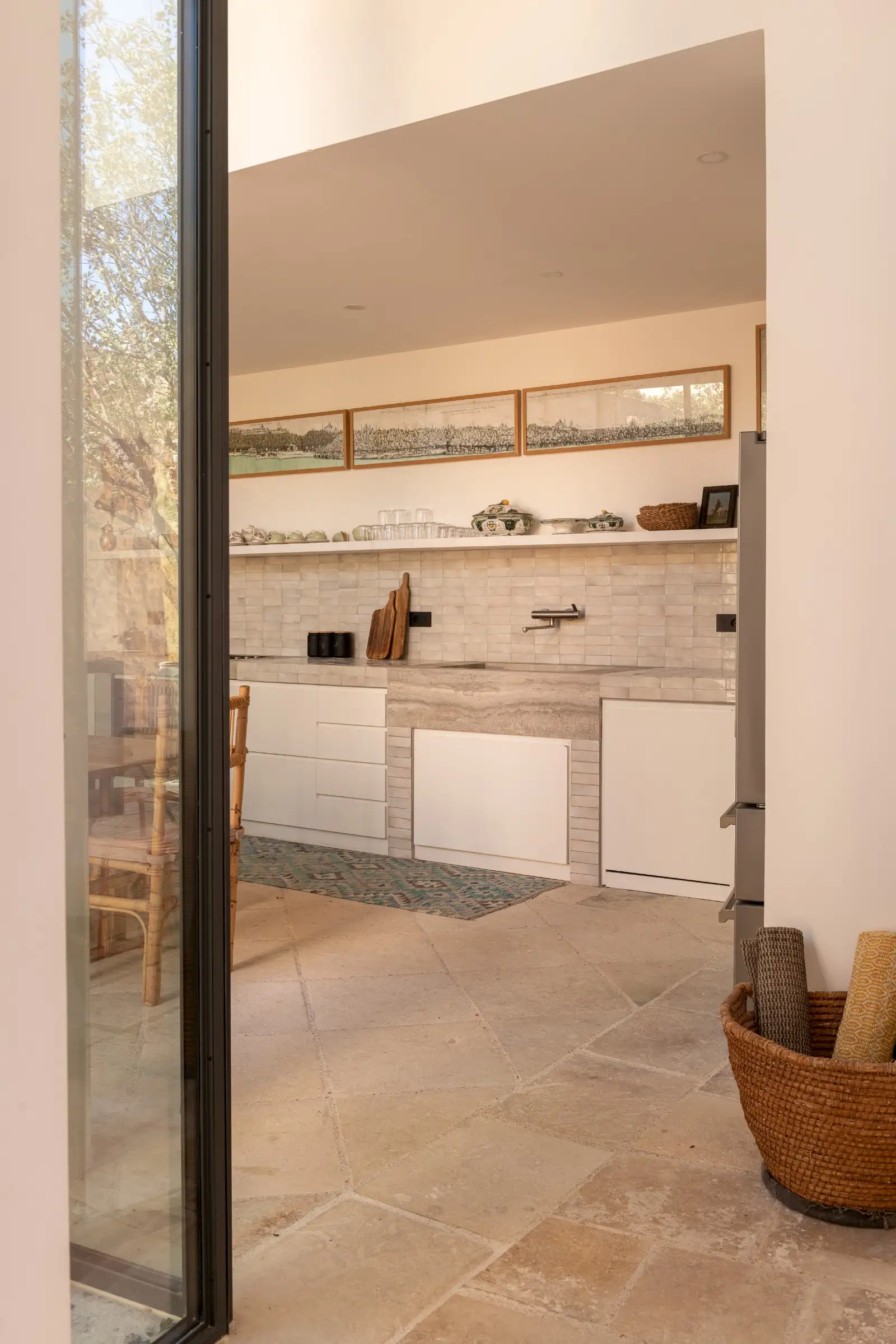 Guests leave the sun-baked street via a wooden door and step into the delicious cool of the entrance hall with its stone floor and star-vaulted ceiling. A ground-floor courtyard garden bathes the downstairs living room in soft light through the wall of floor-to-ceiling glass, while a small pool sits on top of the new kitchen extension.