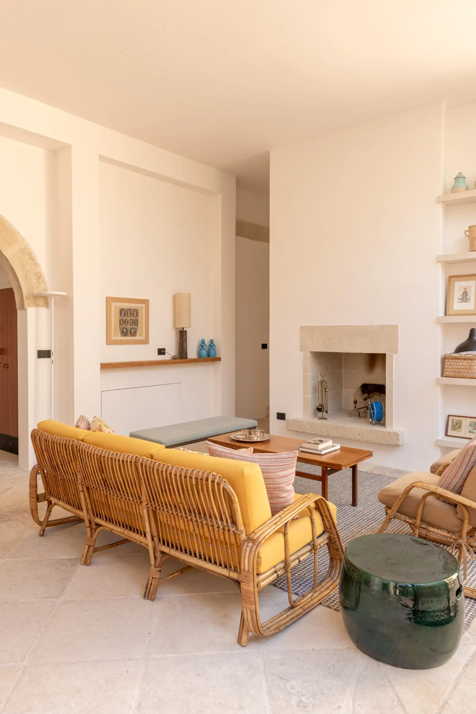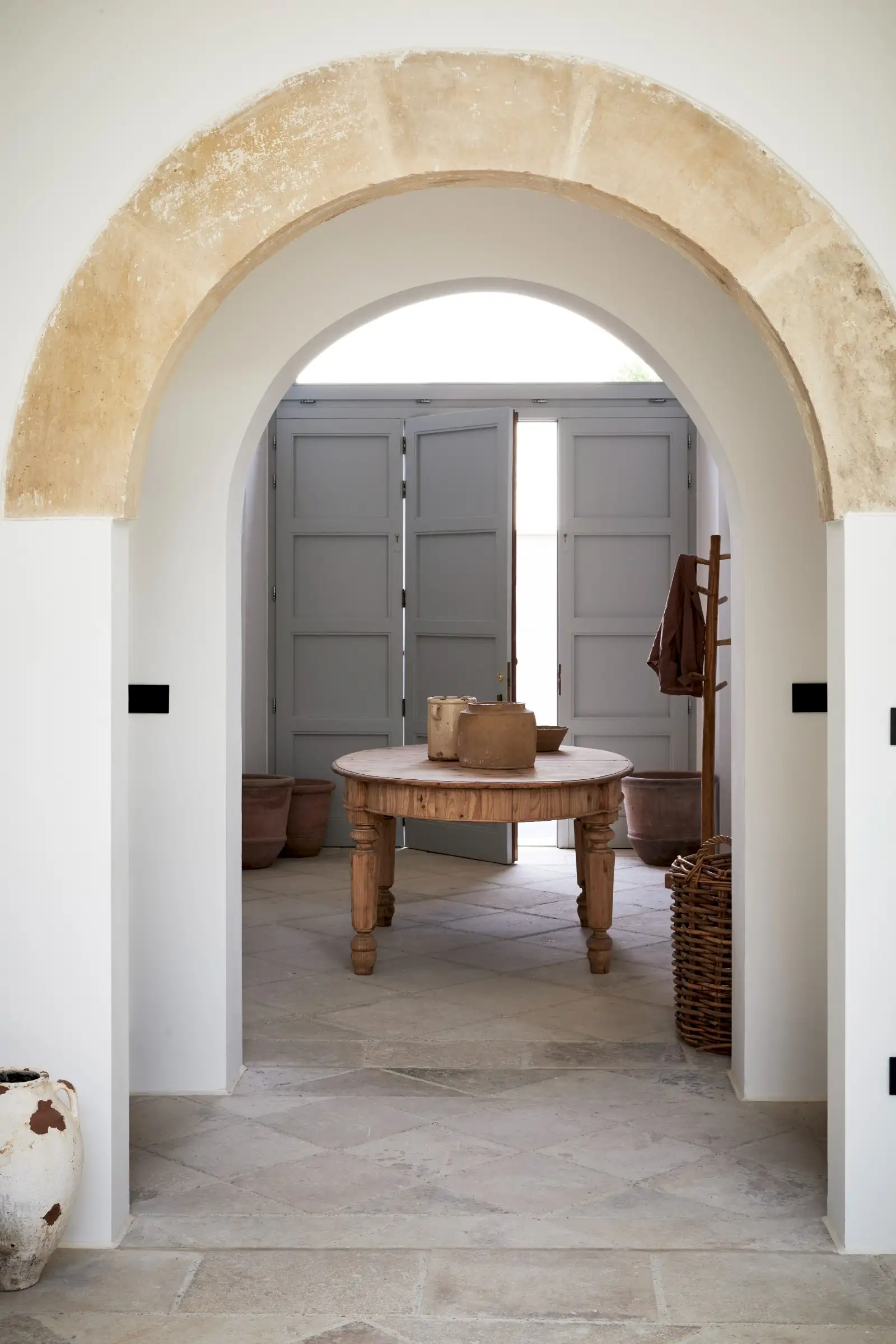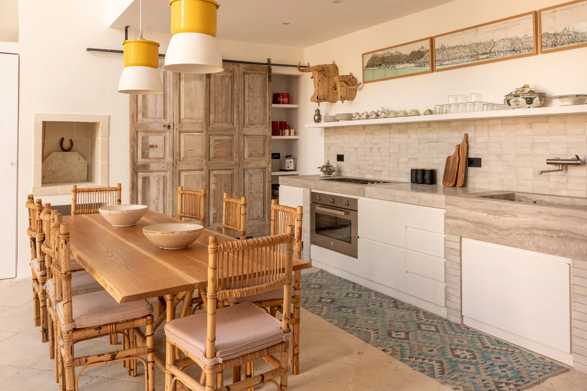 Natural materials such as stone, wood and linen give texture and soul to the property and the decoration is a clever mix of soft earthy colours, original art, and pieces that gently root guests to the location – such as terracotta olive oil jugs and salvaged double wooden doors. Architectural features such as niches are both practical and decorative and two of the four shower rooms are round like trullos.