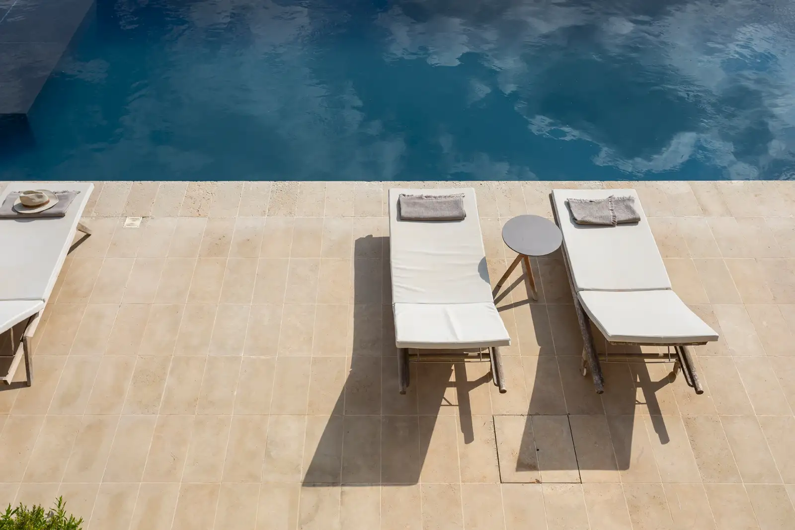 The palatial size of Aura means that its ten guests can easily find some privacy as well as enjoying its multiple outdoor dining spaces, lounge areas and pool. Local stone and smooth white stucco are layered like a two-tier cake, with glass doors as the filling and a metal pergola with its playful shadow pattern, as the decoration on top.