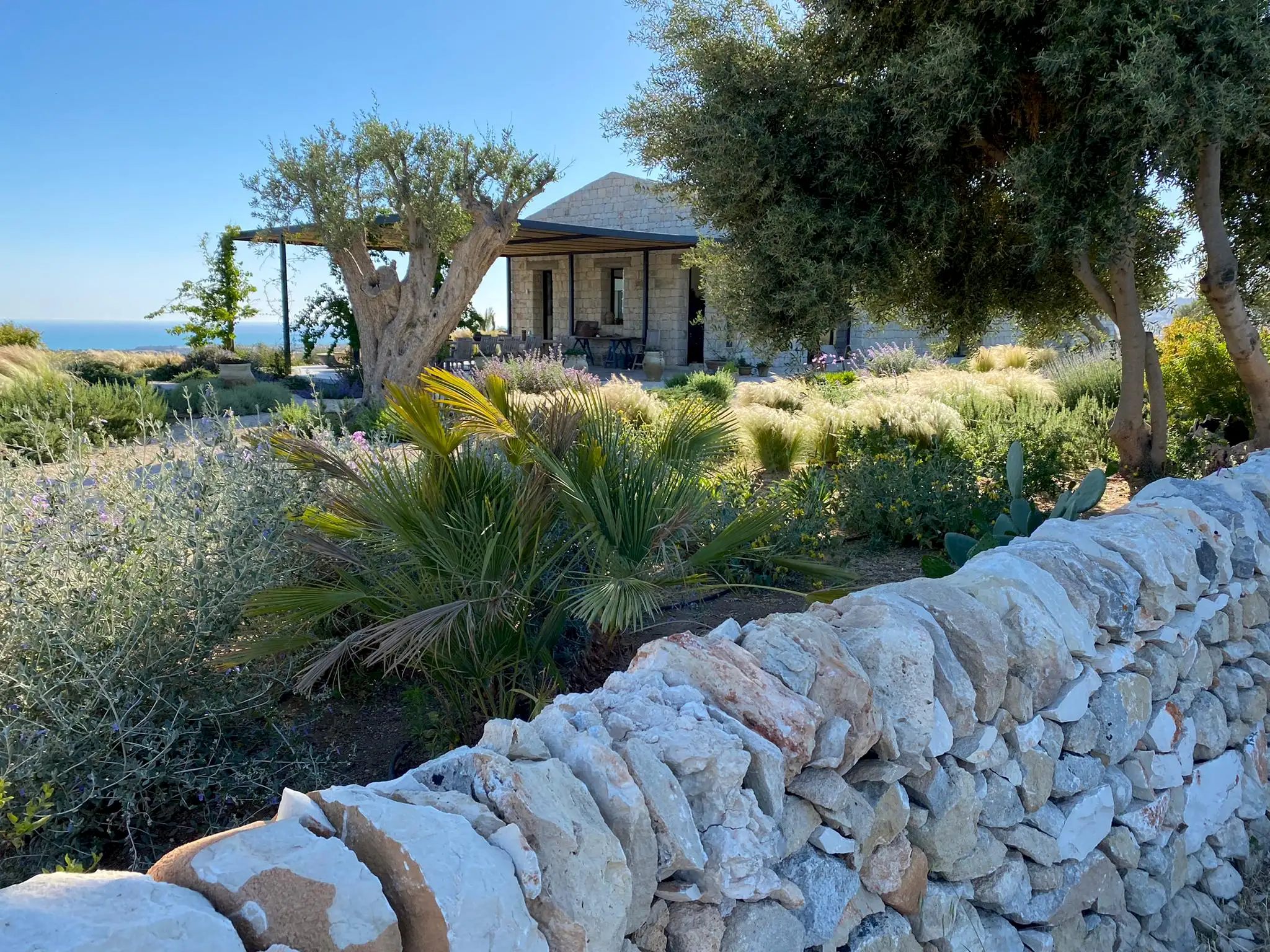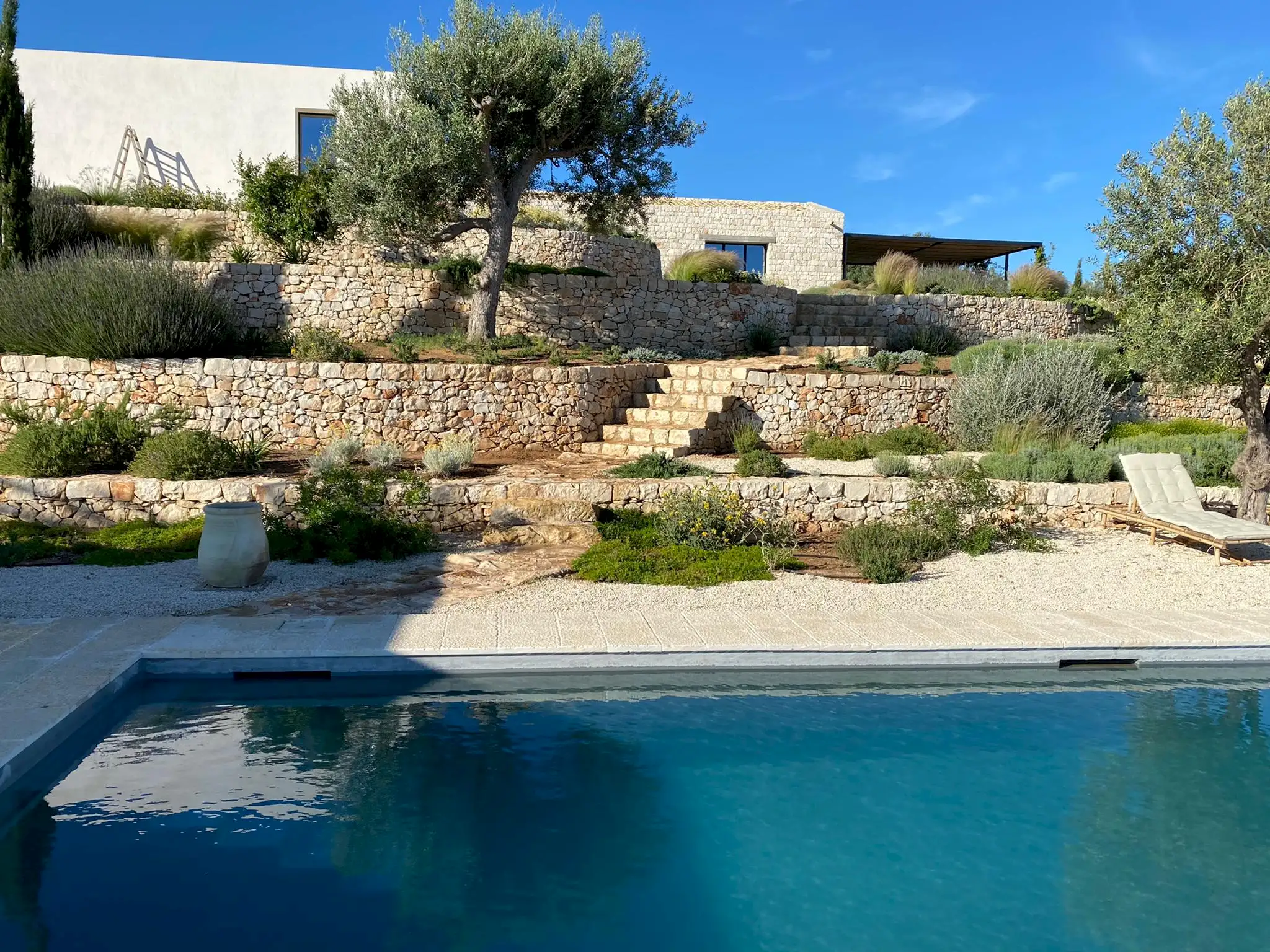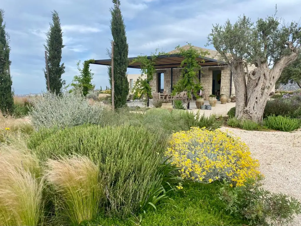 Set on a 50-hectare private estate in the island’s south-eastern corner, the modernist villa is surrounded by olive and almond groves, a fruit orchard and a vegetable patch. The carefully landscaped garden cascades down a series of dry-stone wall terraces to the large pool.