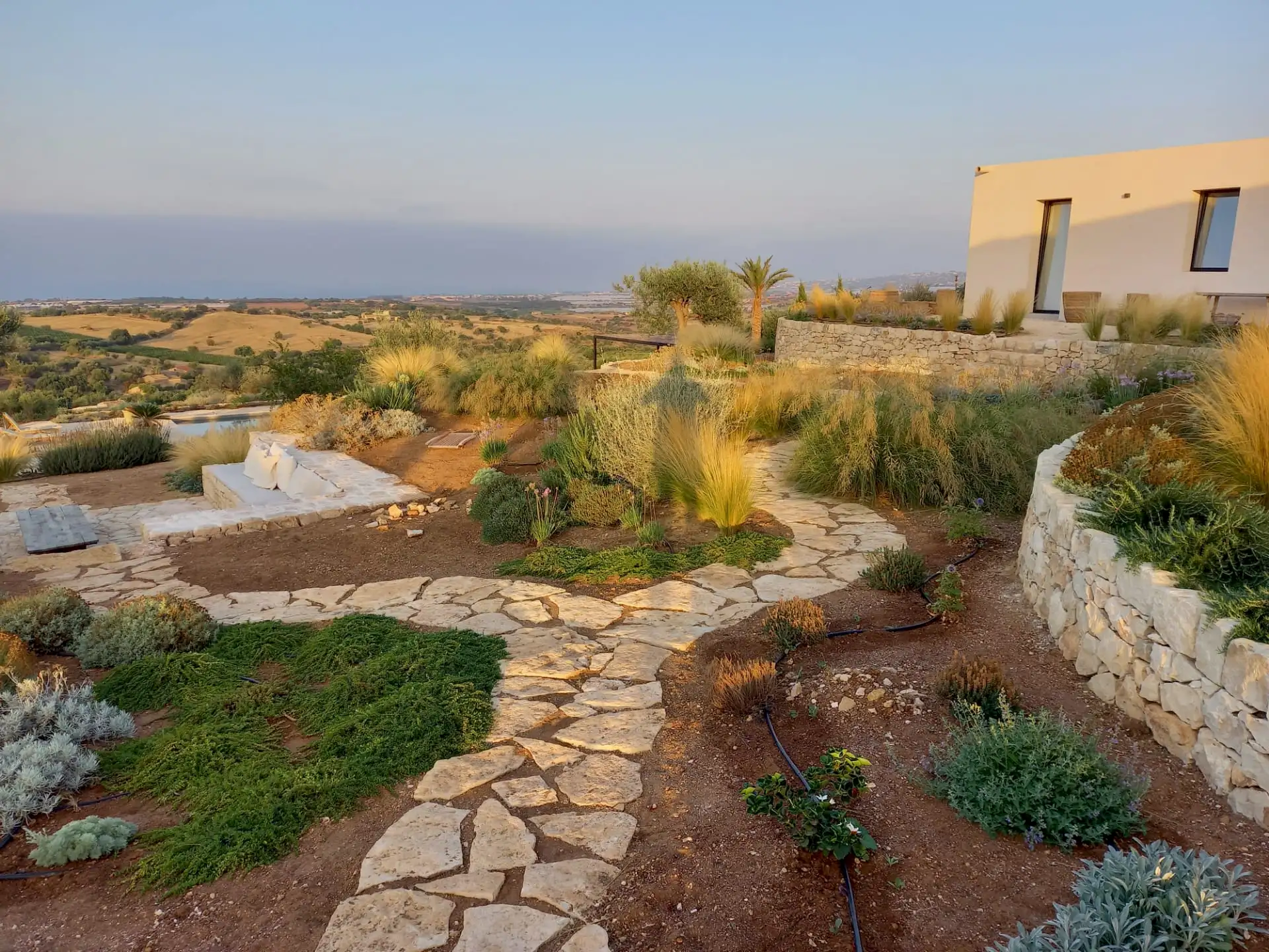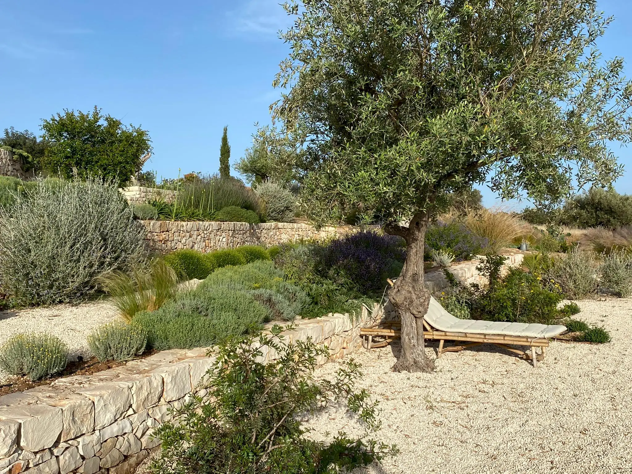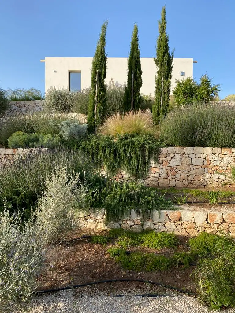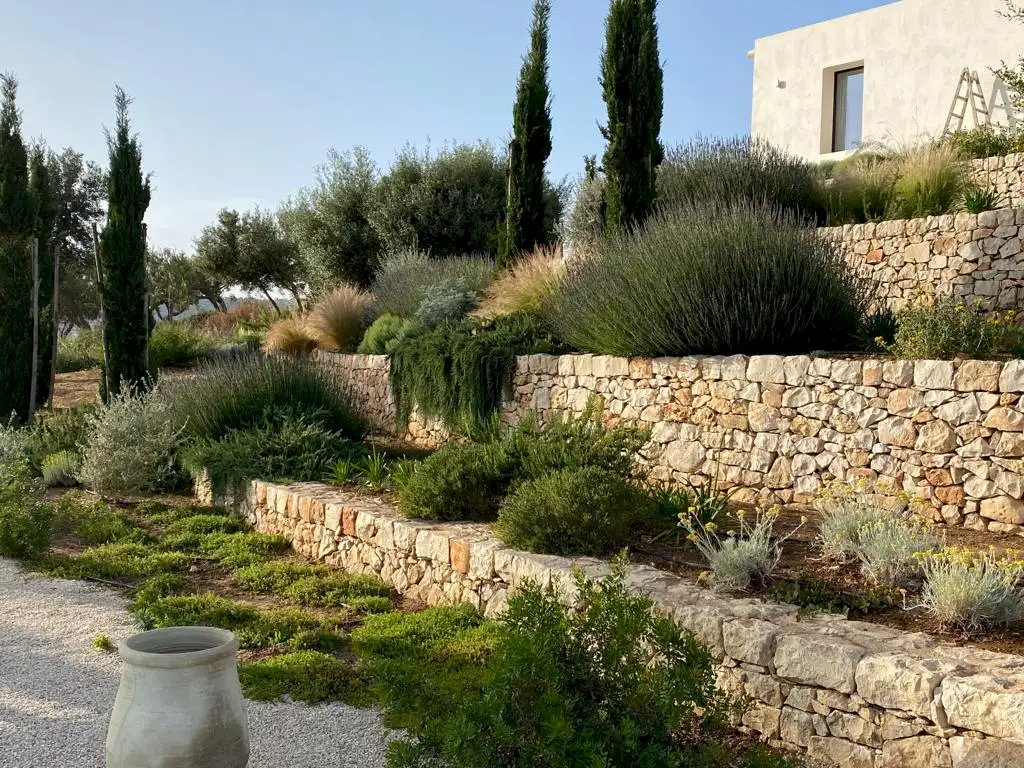 Set on a 50-hectare private estate in the island’s south-eastern corner, the modernist villa is surrounded by olive and almond groves, a fruit orchard and a vegetable patch. The carefully landscaped garden cascades down a series of dry-stone wall terraces to the large pool.