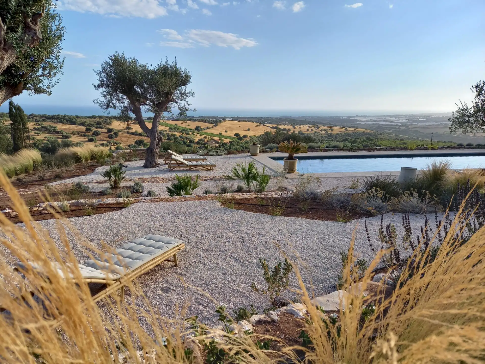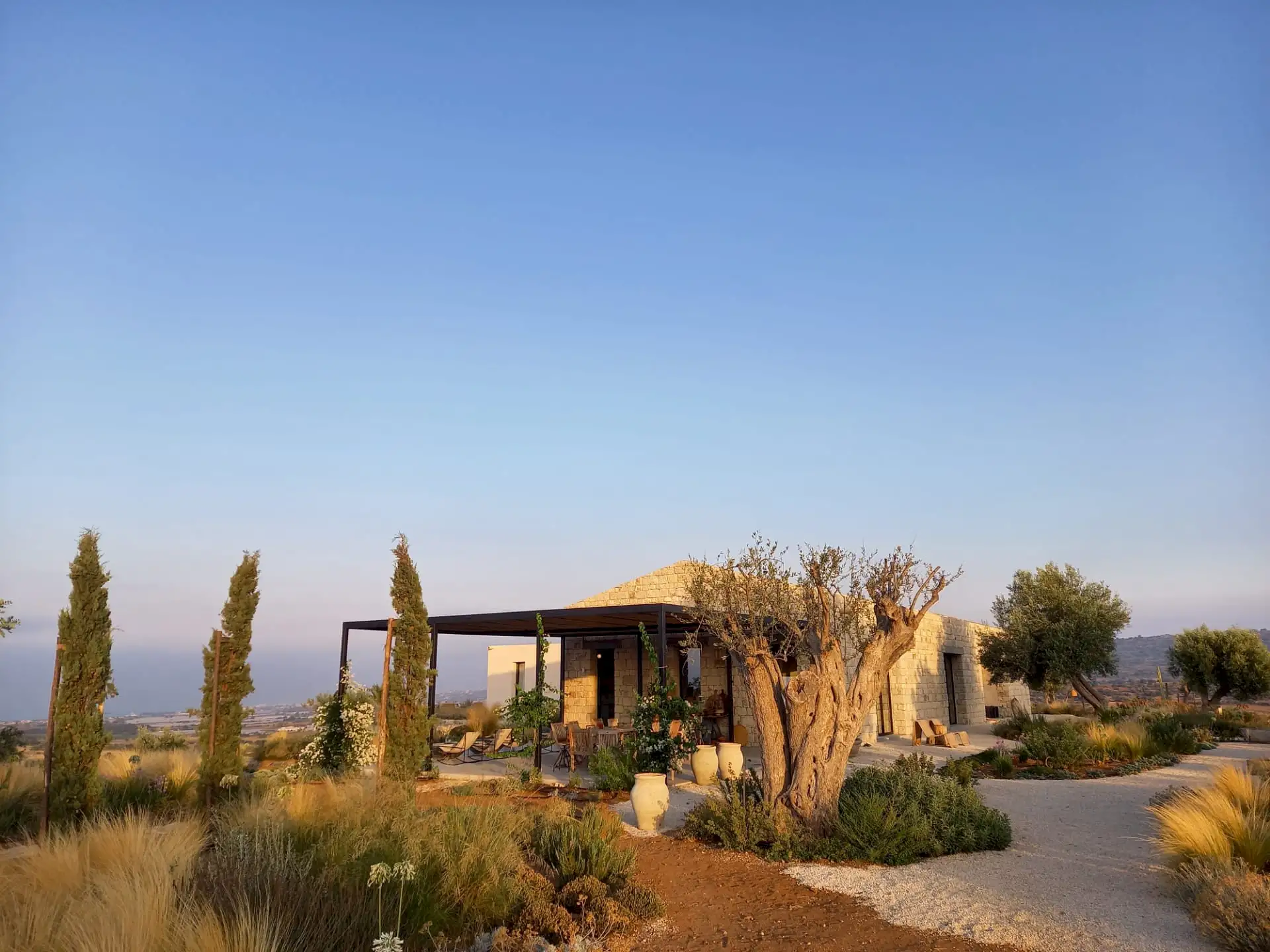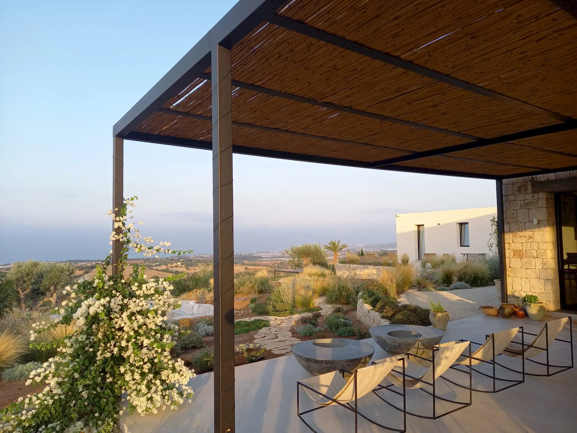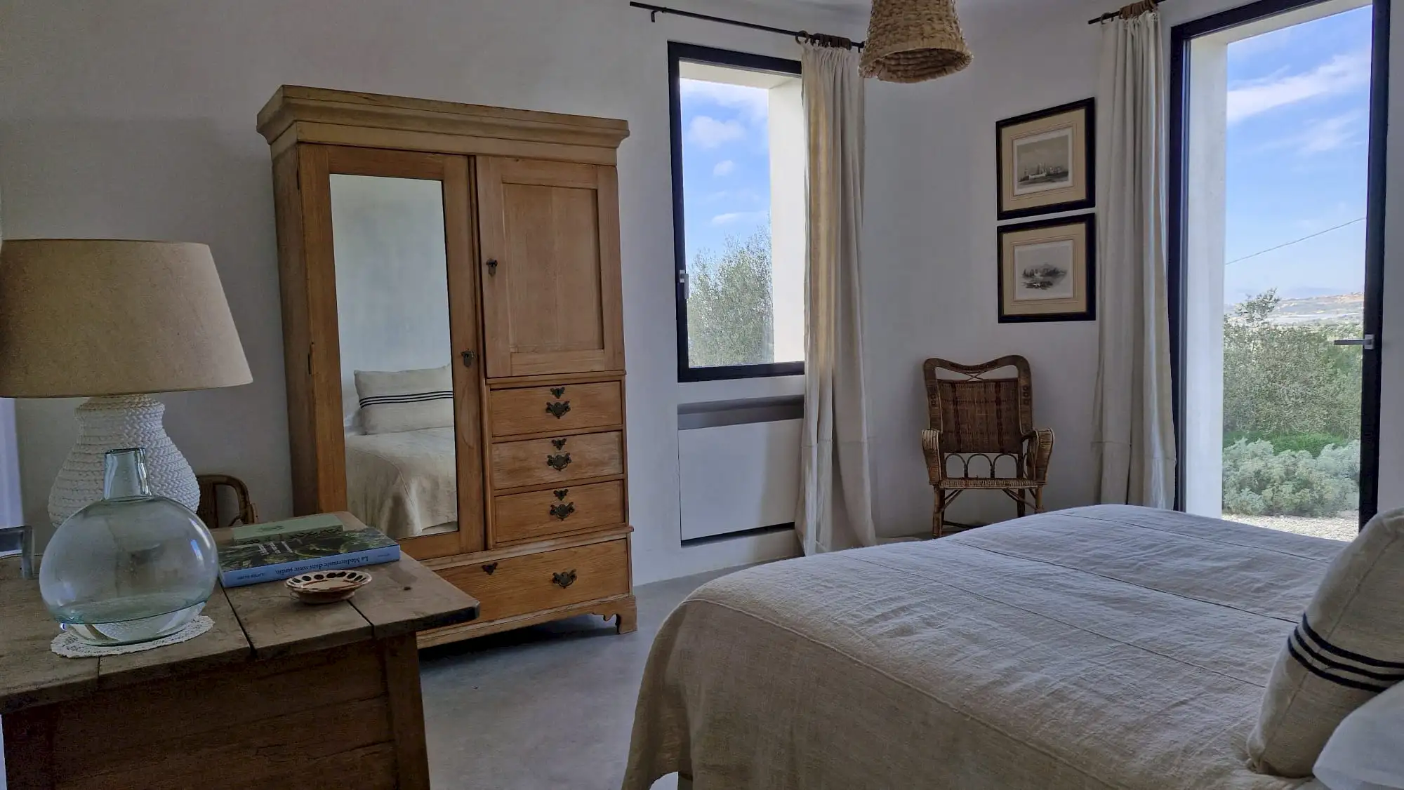 The design has been as carefully balanced inside as out, and the six en-suite doubles are individually decorated with original art, lighting and furniture, both modern and antique, much of it championing local makers. Smooth floors, a well-equipped kitchen and a vast living room all have doors to outside that can be kept open to create a breeze, even in the heat of summer.