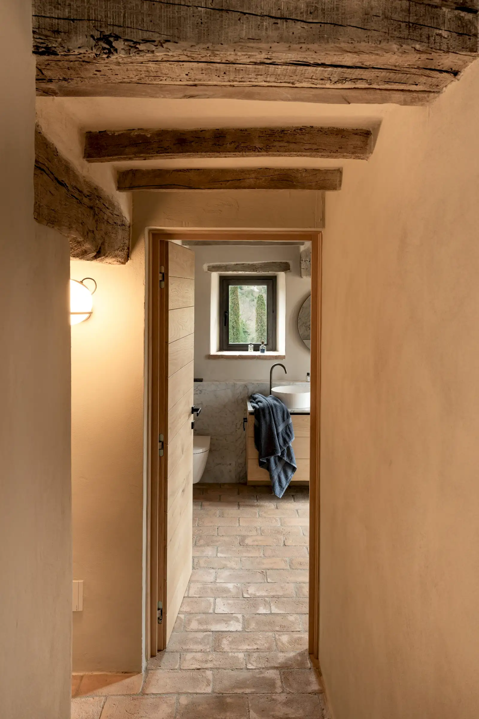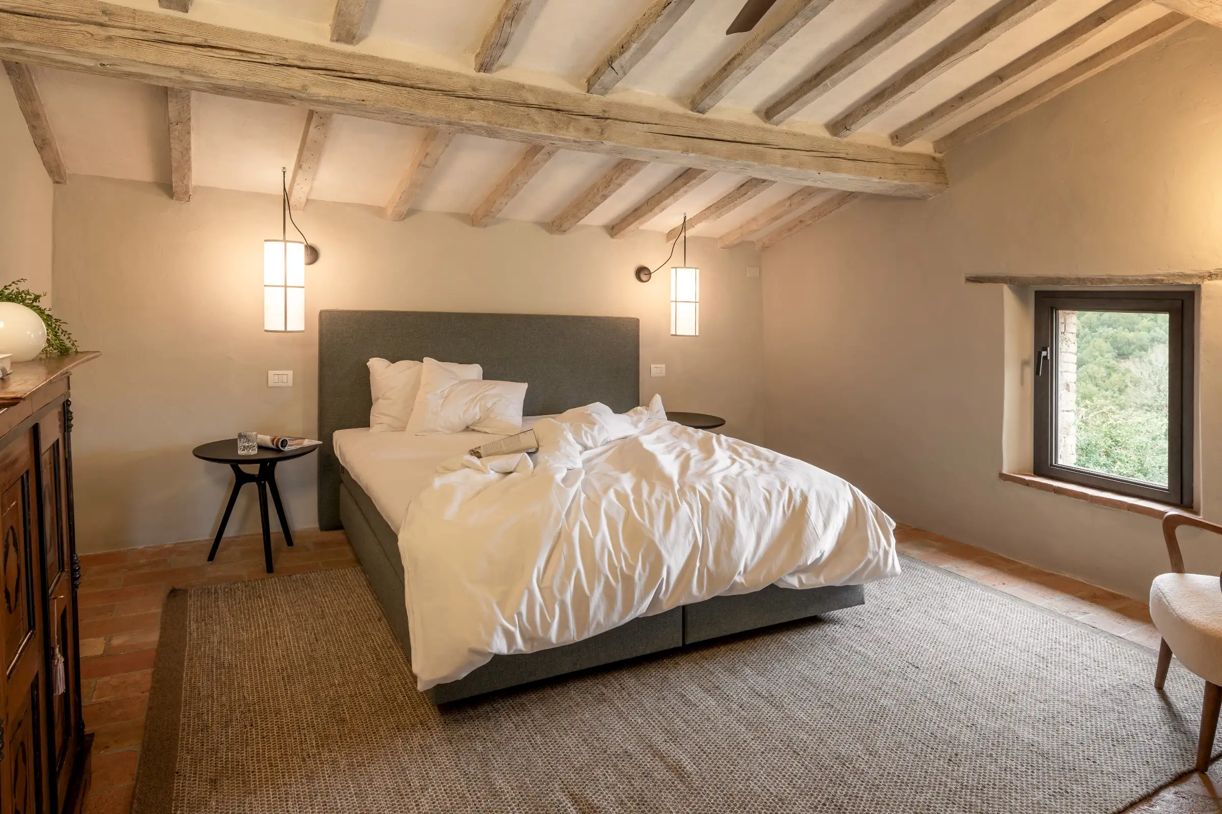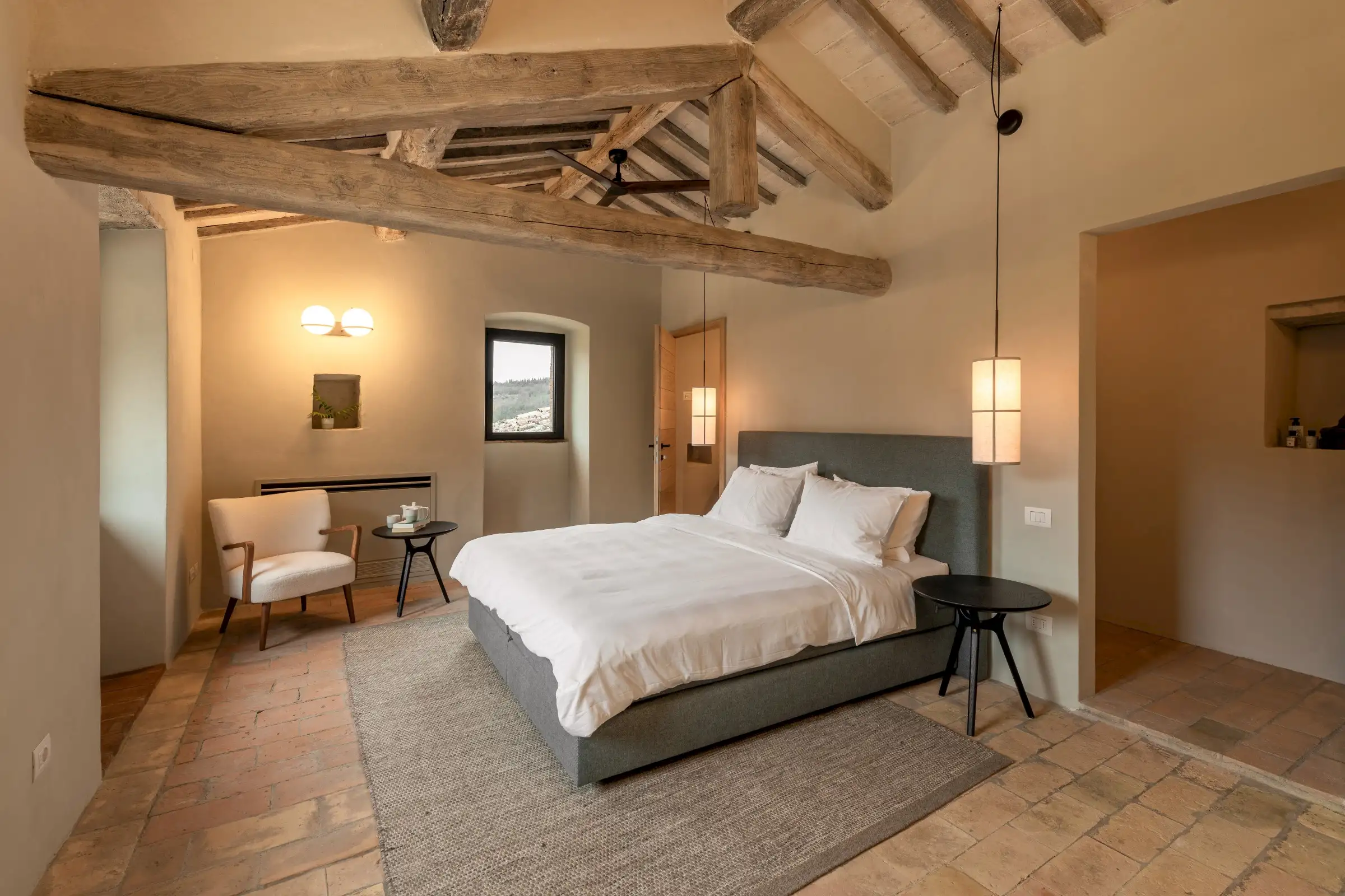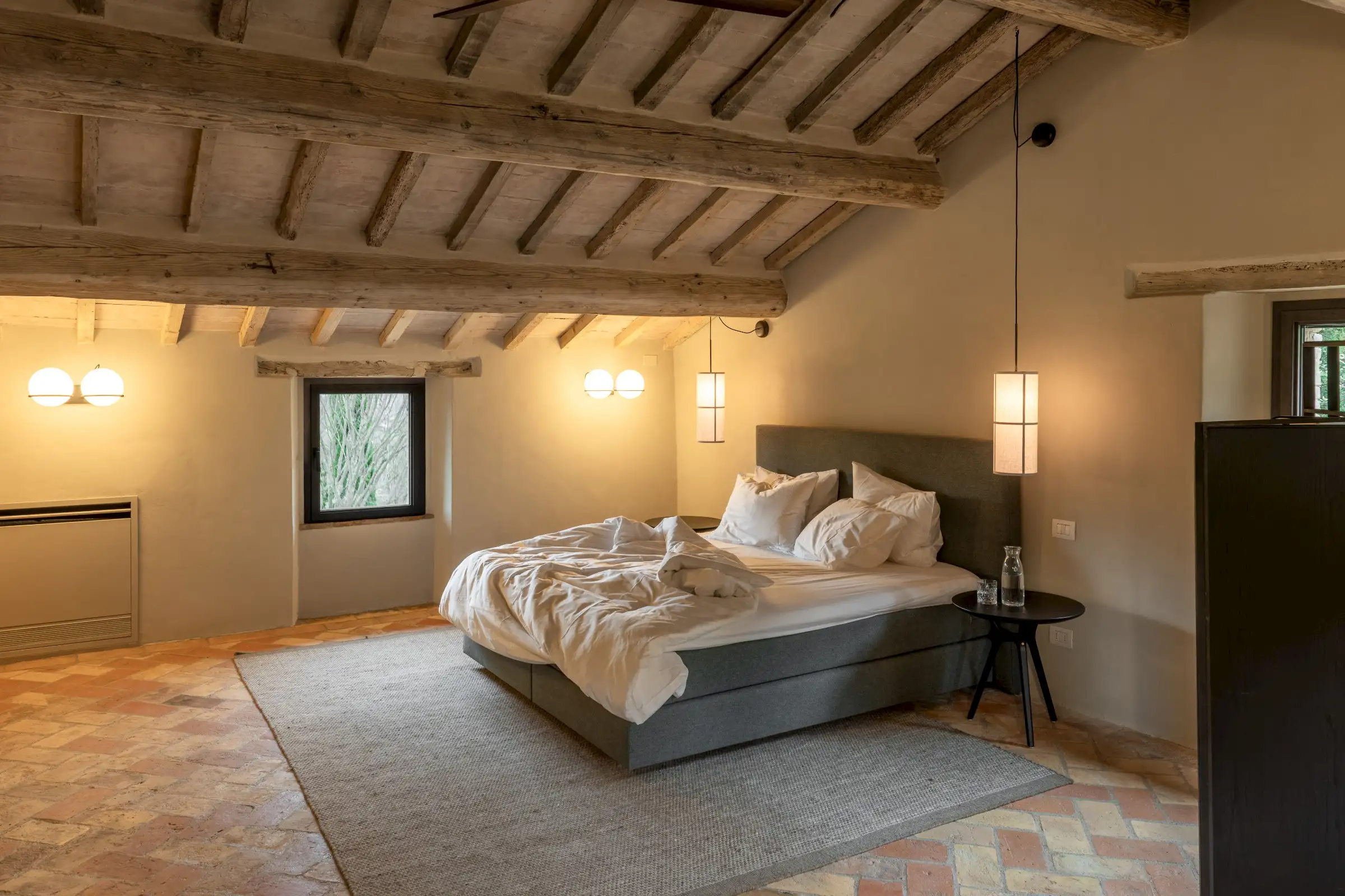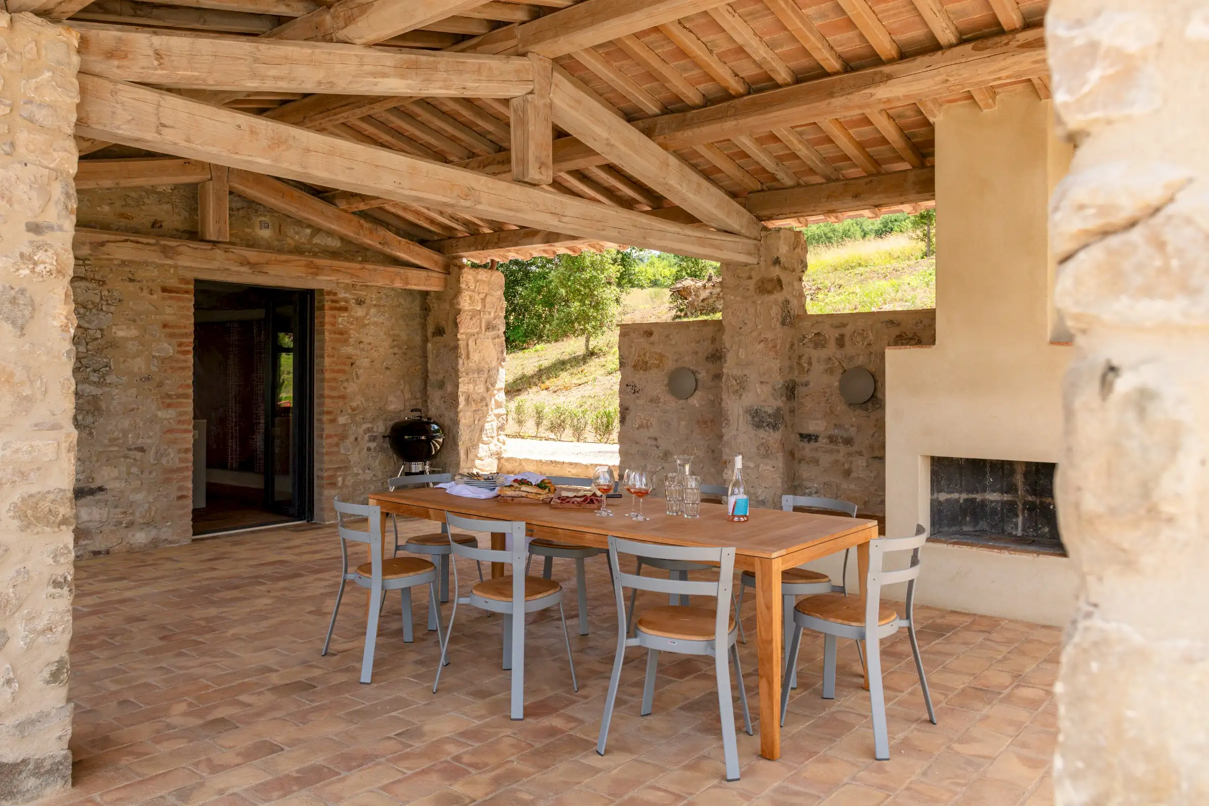 There’s plenty of space for guests to find themselves a quiet corner and a kitchen that’s a delight to cook in although you could always hand over to a private chef for a special dinner or for your entire holiday. There’s even a covered outdoor dining and sitting area with a chimneyed fireplace: wrap up warm and enjoy a Boxing Day lunch looking out at the wooded hills reaching to the Appenines.
