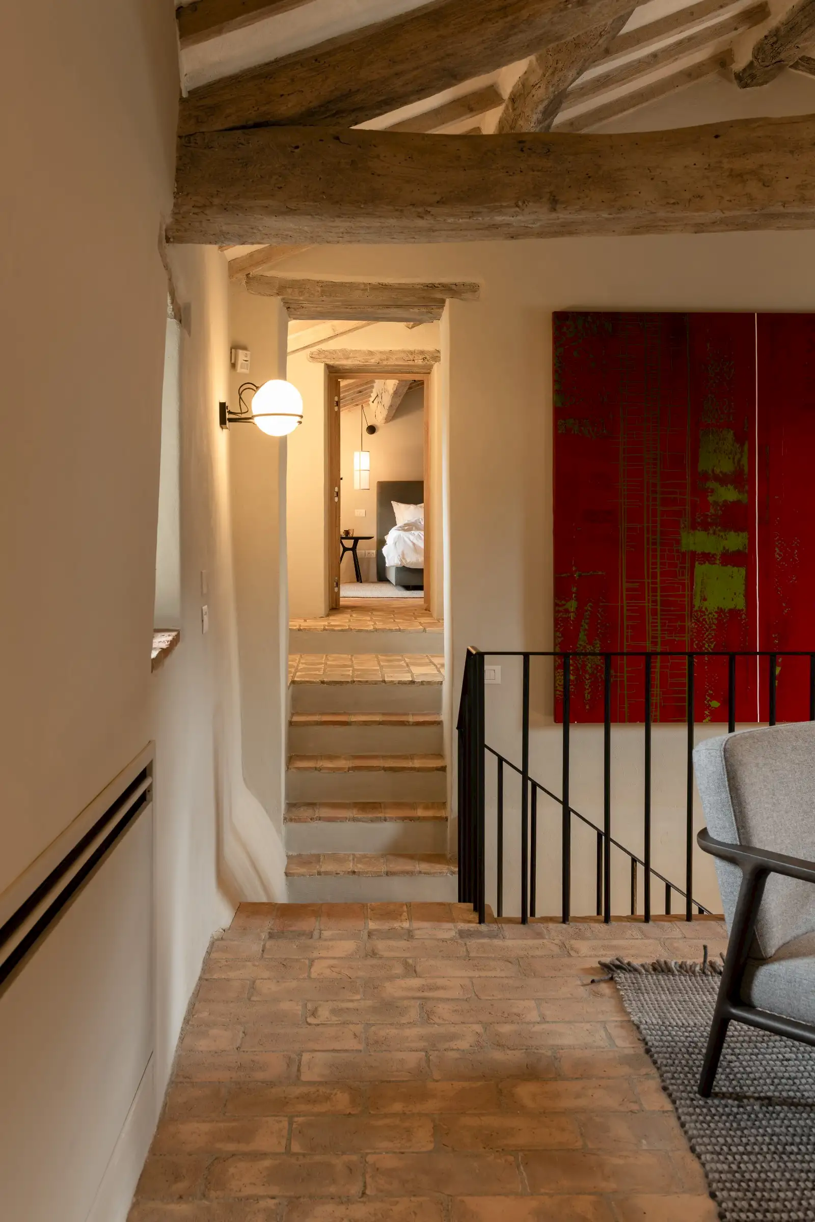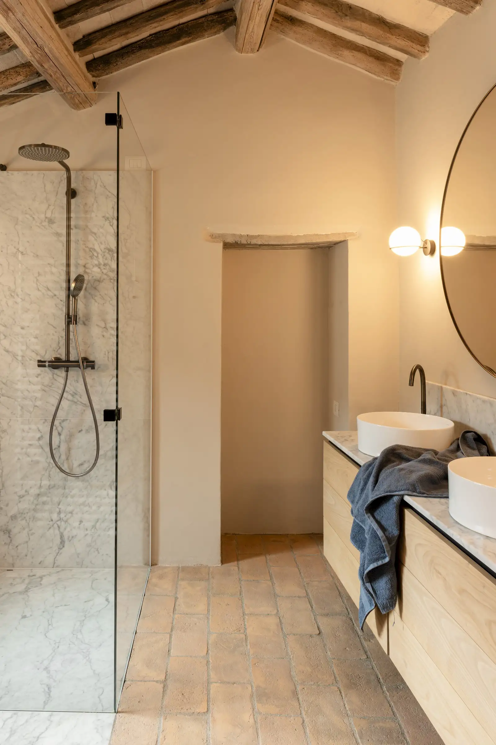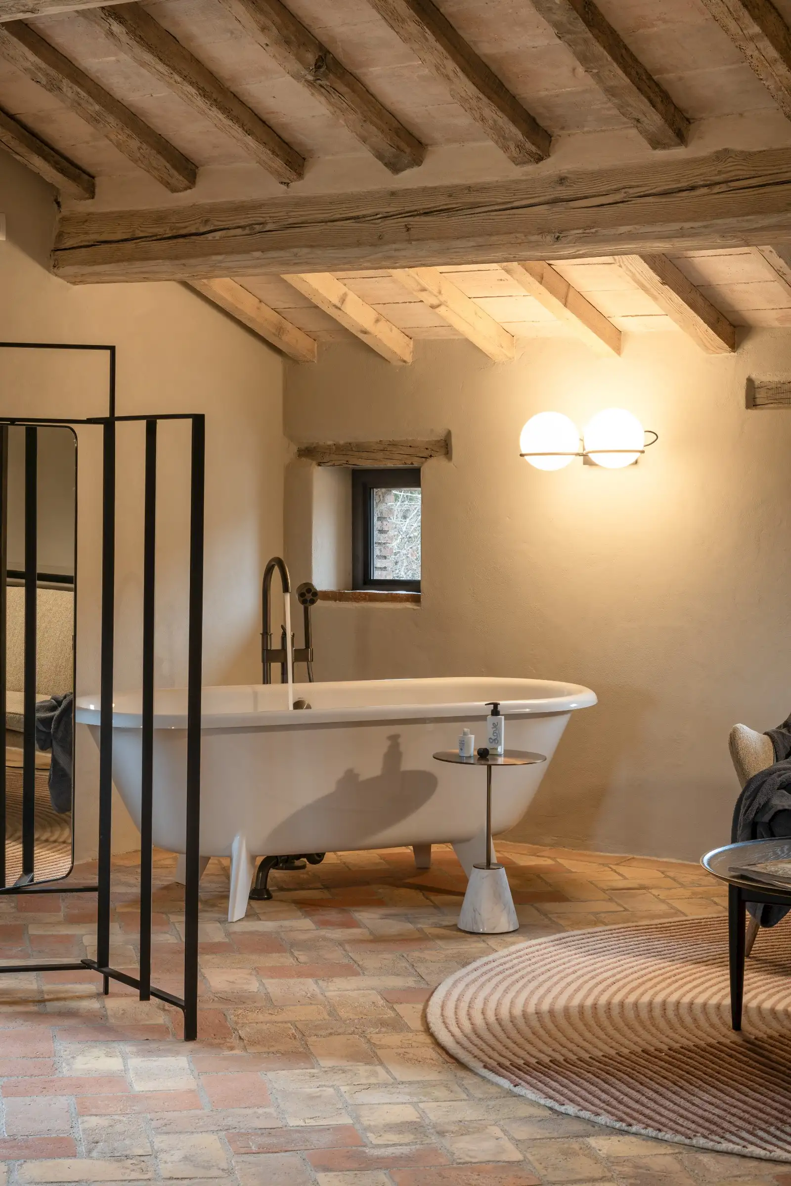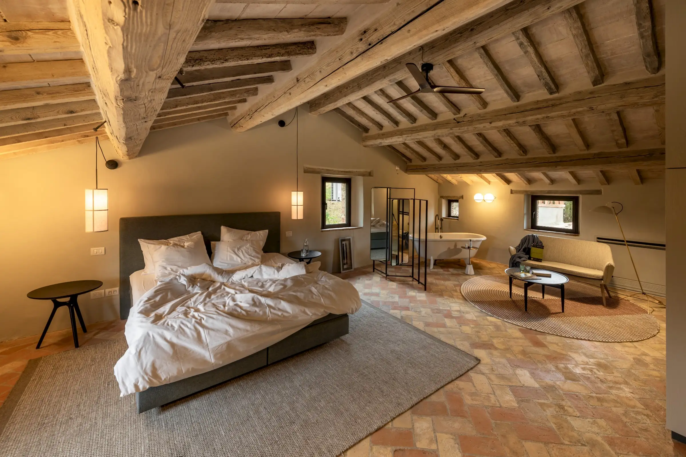 There’s plenty of space for guests to find themselves a quiet corner and a kitchen that’s a delight to cook in although you could always hand over to a private chef for a special dinner or for your entire holiday. There’s even a covered outdoor dining and sitting area with a chimneyed fireplace: wrap up warm and enjoy a Boxing Day lunch looking out at the wooded hills reaching to the Appenines.