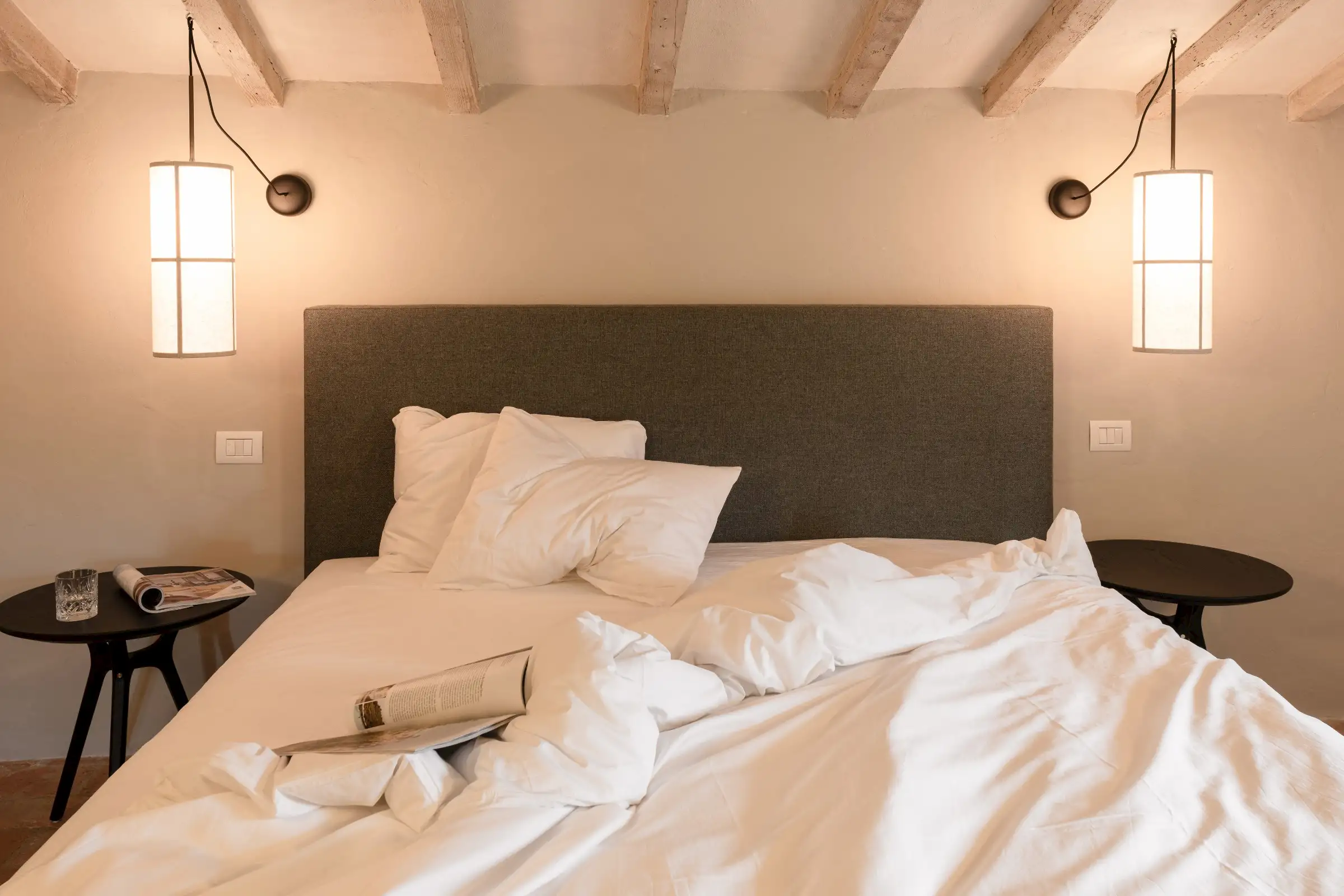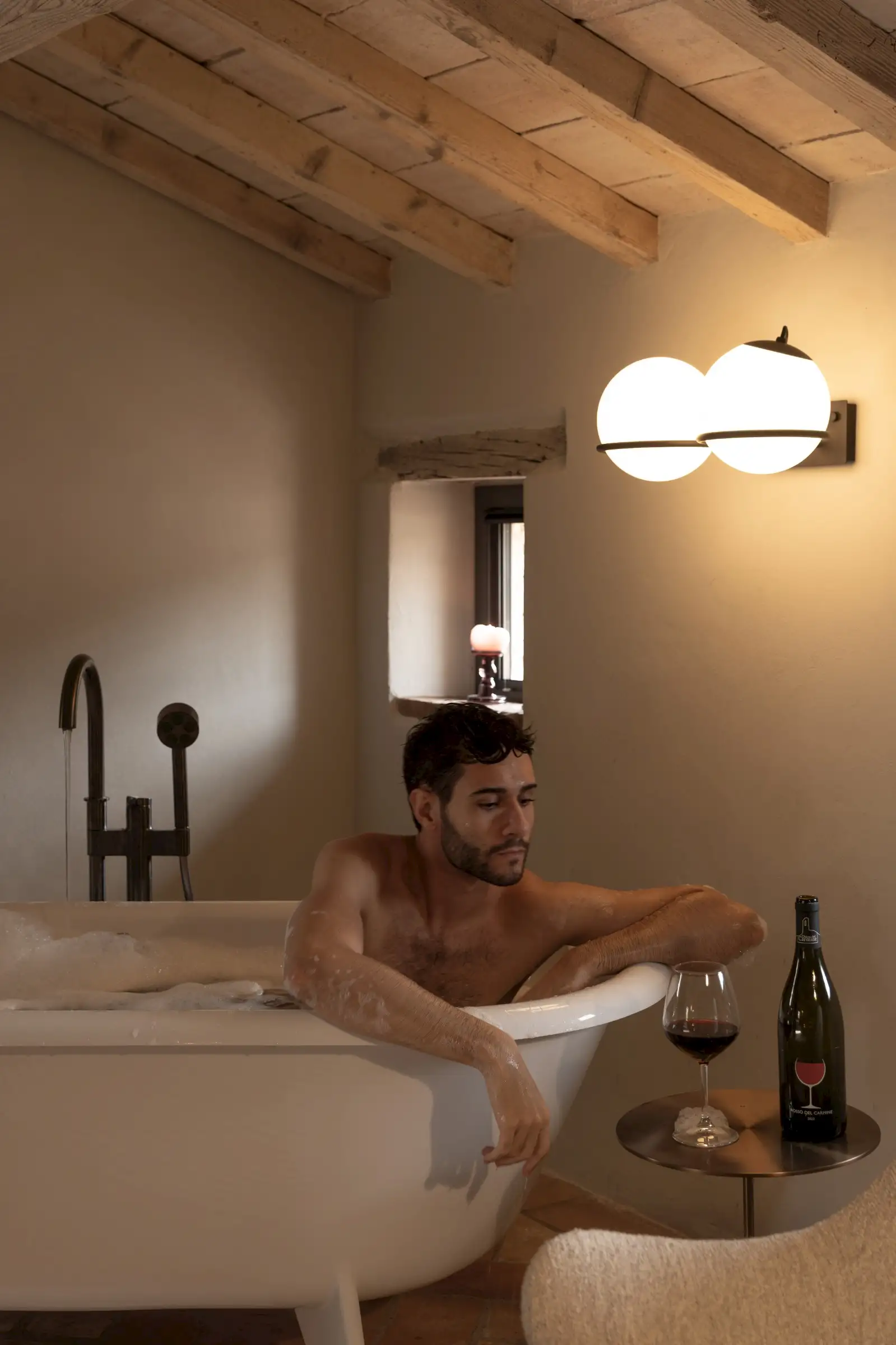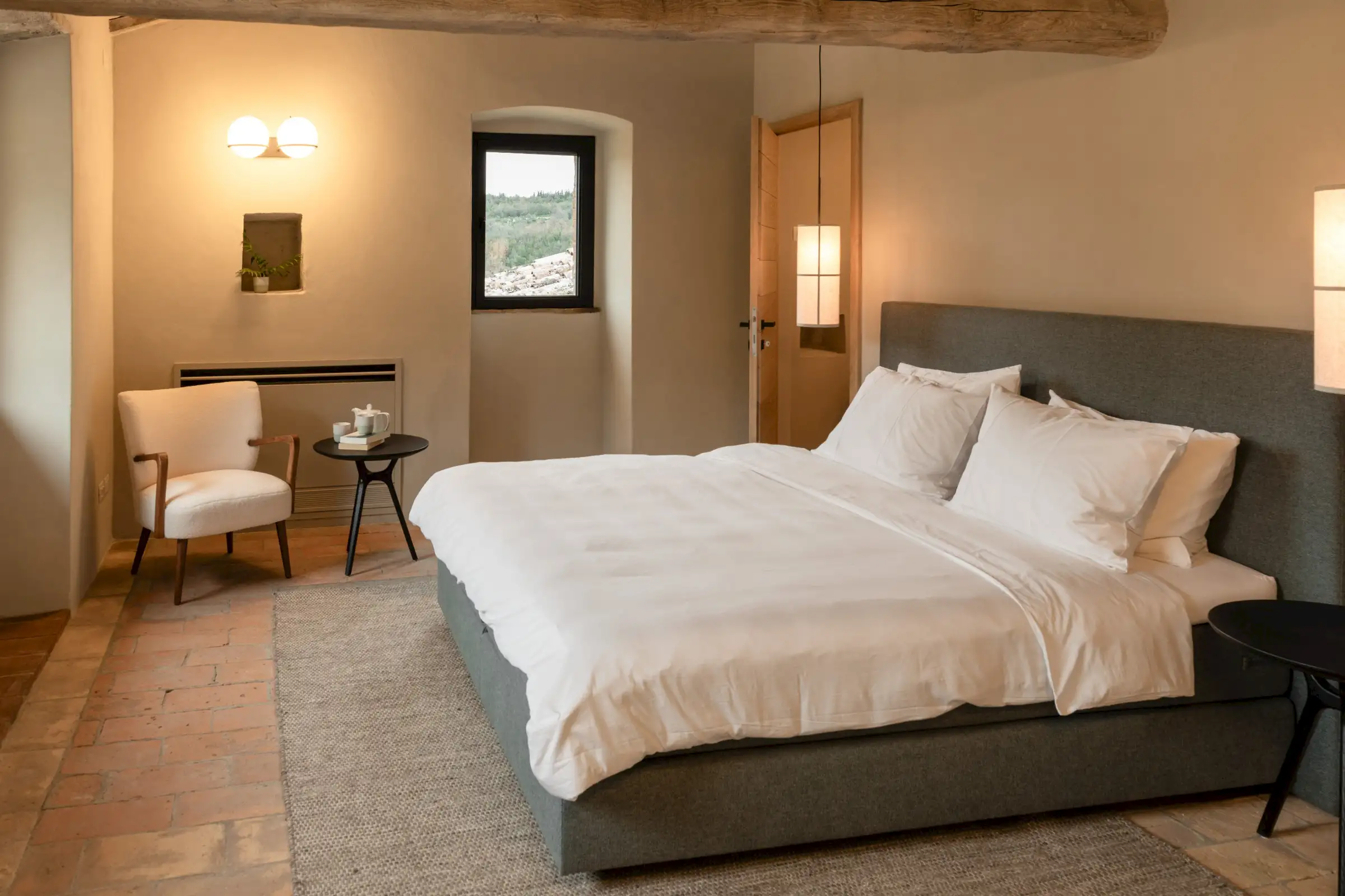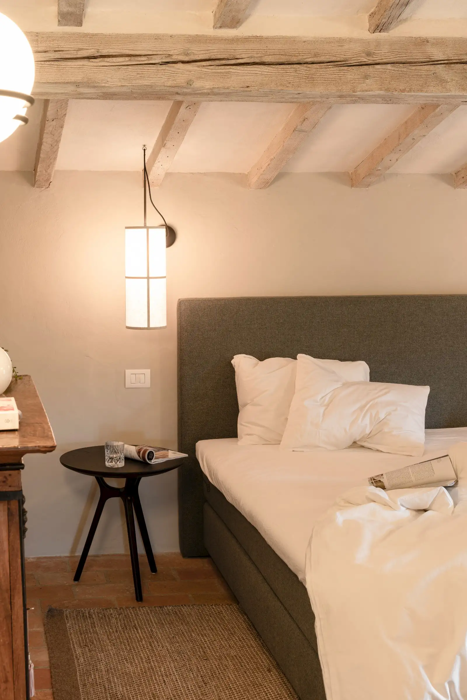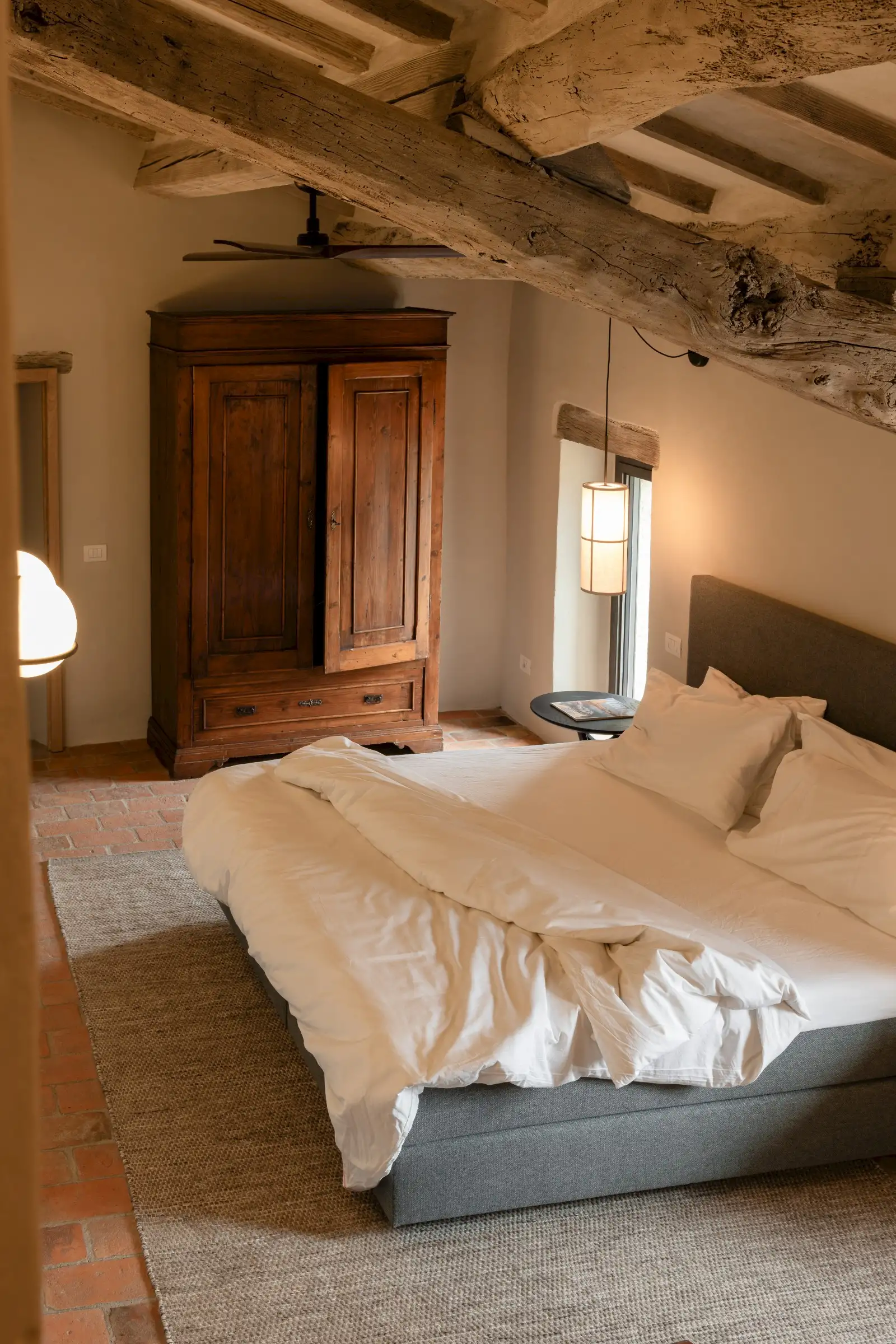 There’s plenty of space for guests to find themselves a quiet corner and a kitchen that’s a delight to cook in although you could always hand over to a private chef for a special dinner or for your entire holiday. There’s even a covered outdoor dining and sitting area with a chimneyed fireplace: wrap up warm and enjoy a Boxing Day lunch looking out at the wooded hills reaching to the Appenines.