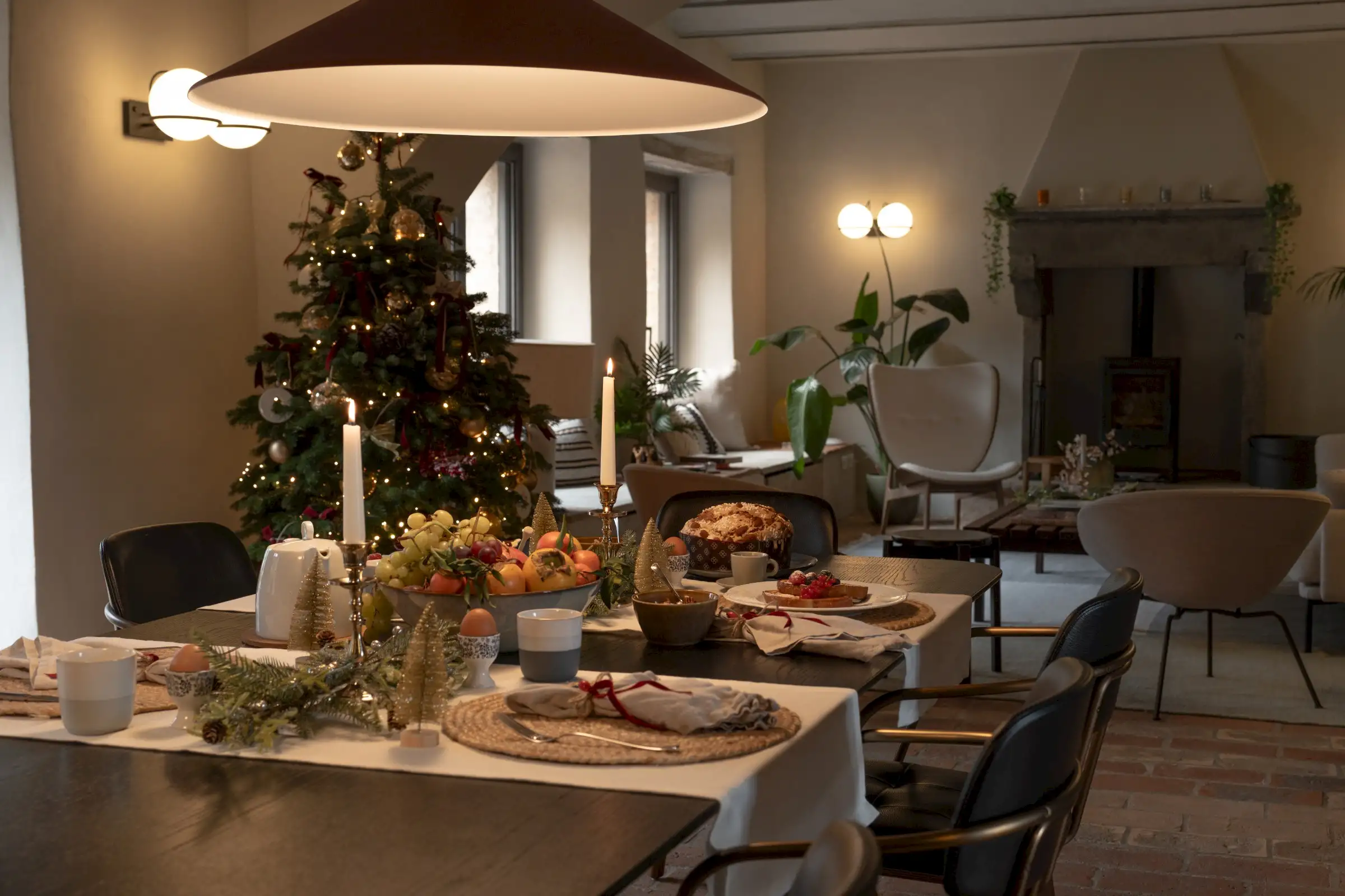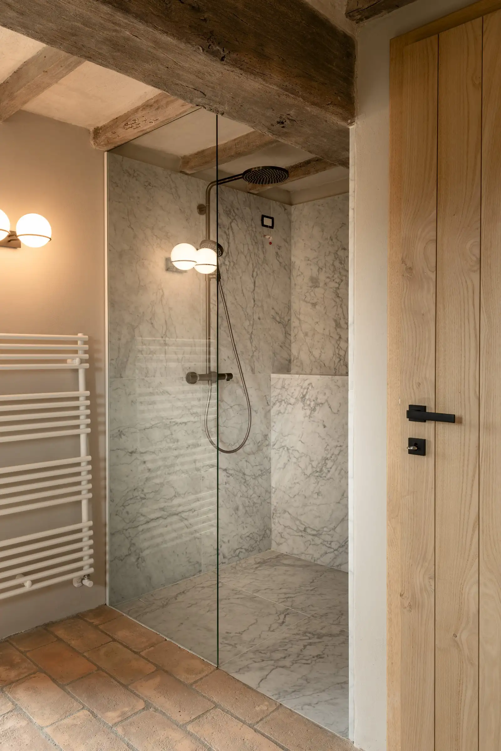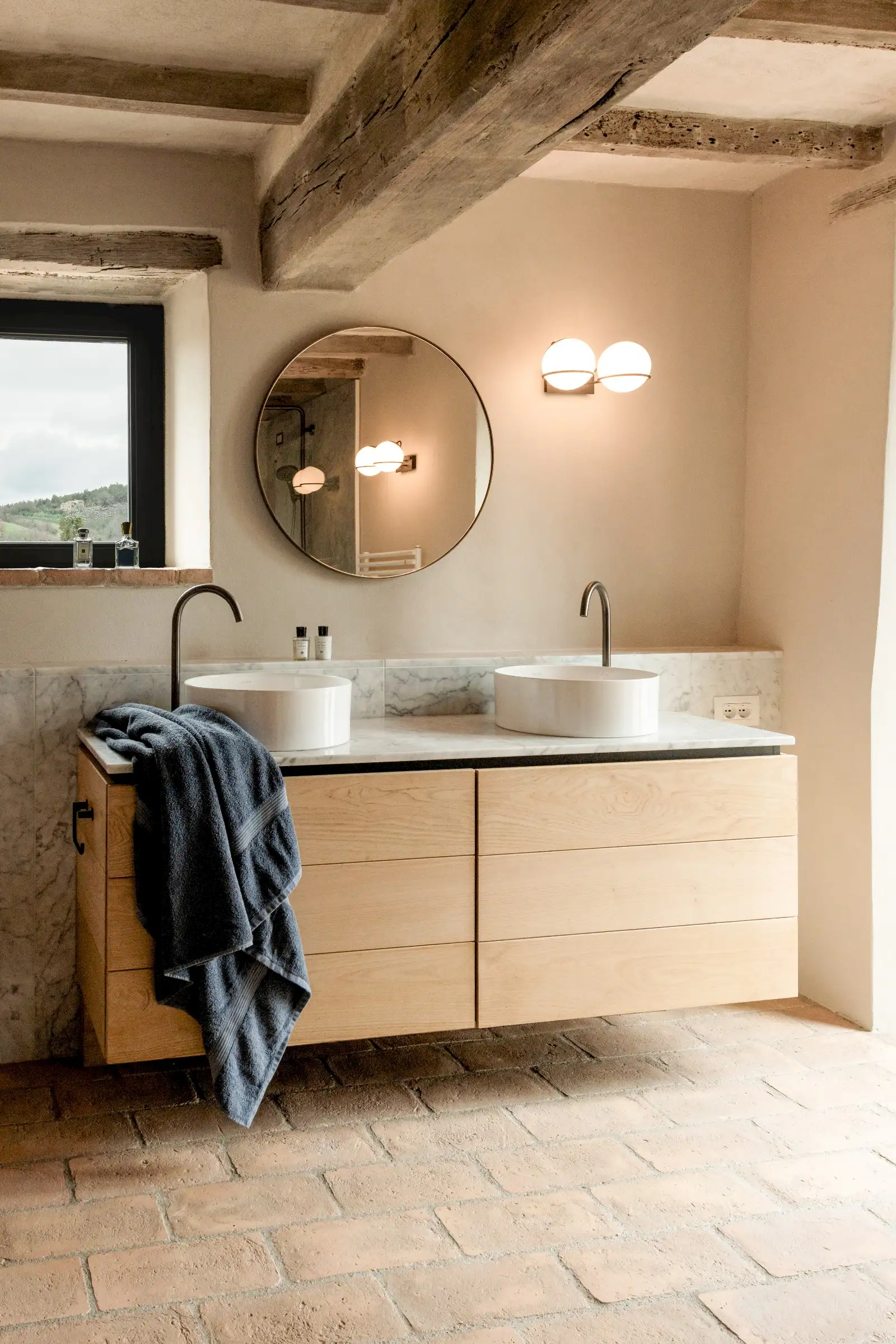 Accommodating ten in five en-suite bedrooms, there is space and comfort in abundance. Here, the property’s original features are the unflashy stars of the show. A soft colour palette reflects the landscape, as does the careful edit of natural materials including different woods, cotto tiles and Carrara marble. You’ll find beds big enough for stocking opening, a dining table that is perfect for a dinner party, fancy or otherwise, and a woodburning stove to snooze in front of. Or head to the upstairs telly room to flop in front of a Christmas film.