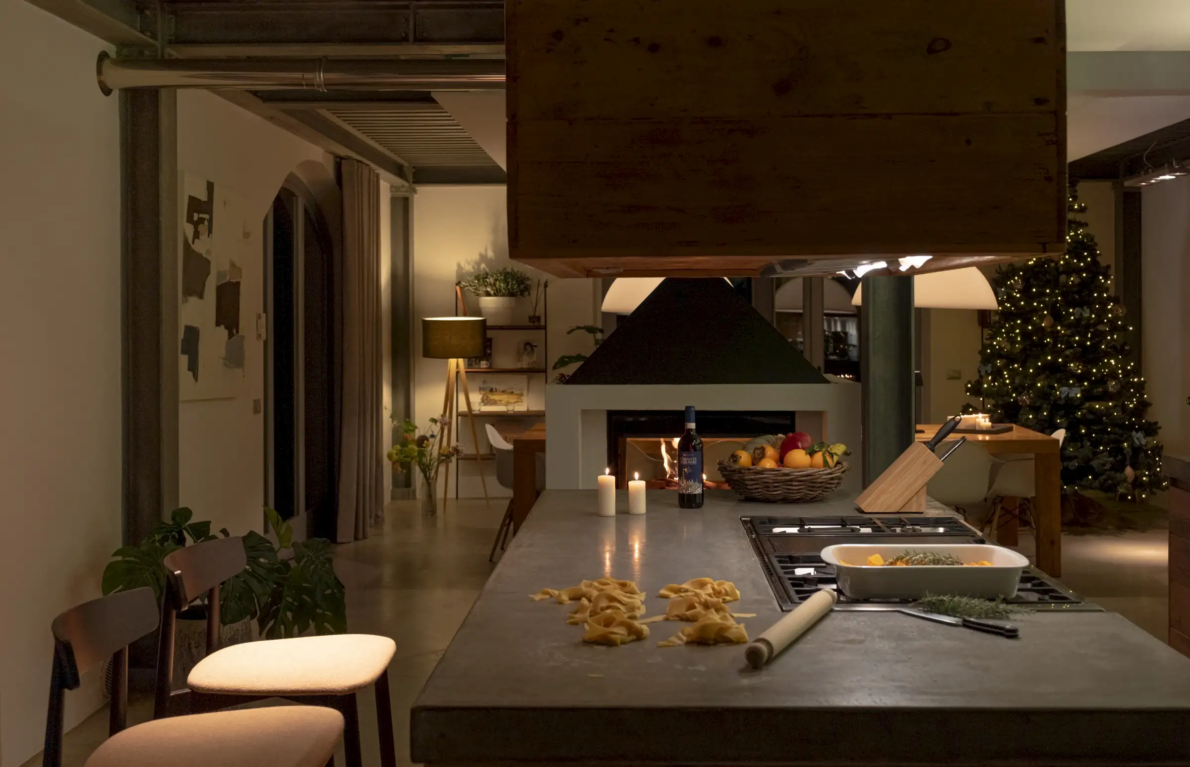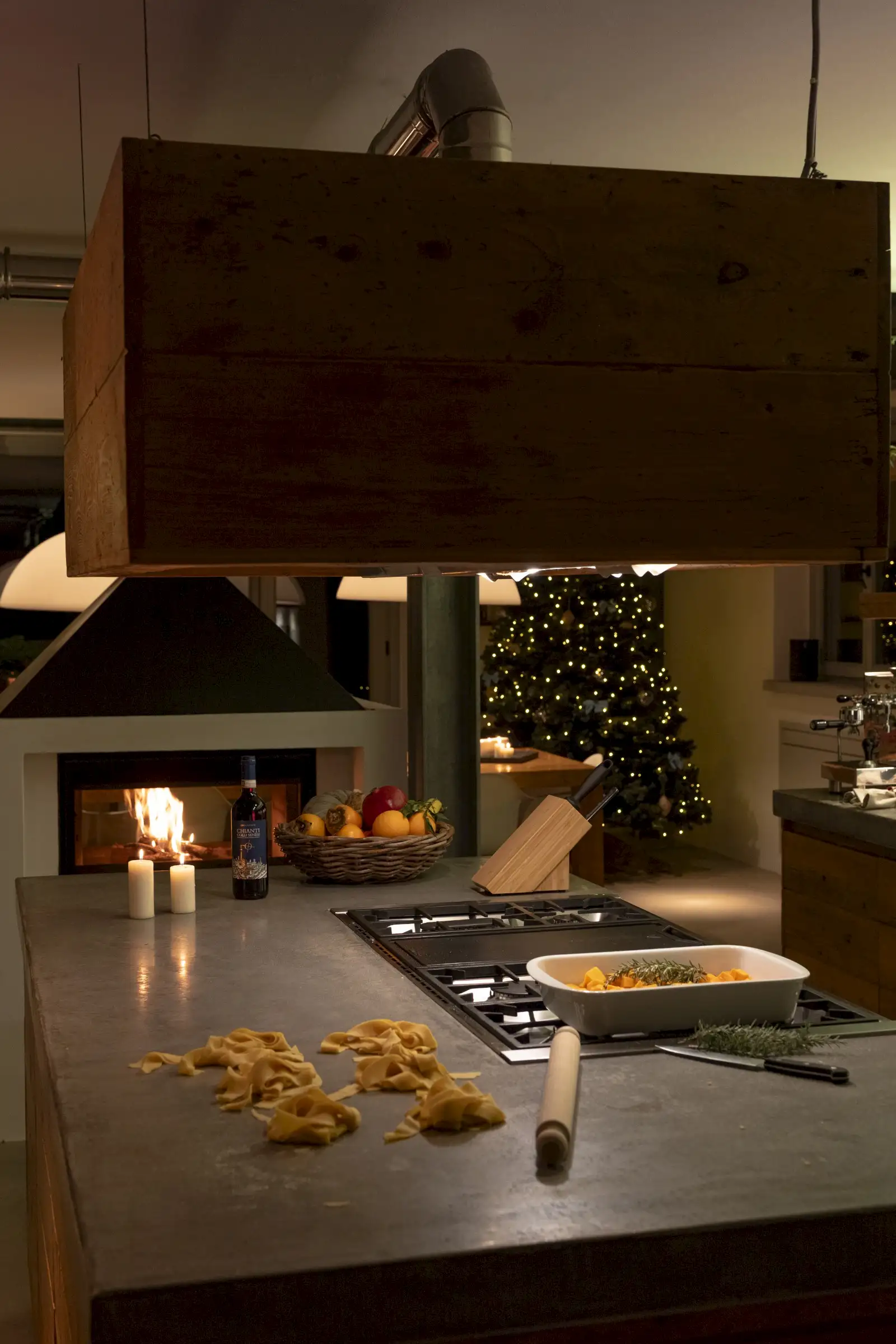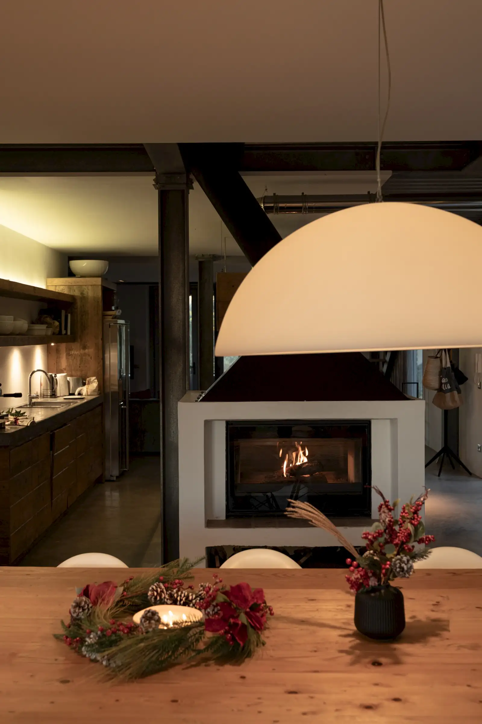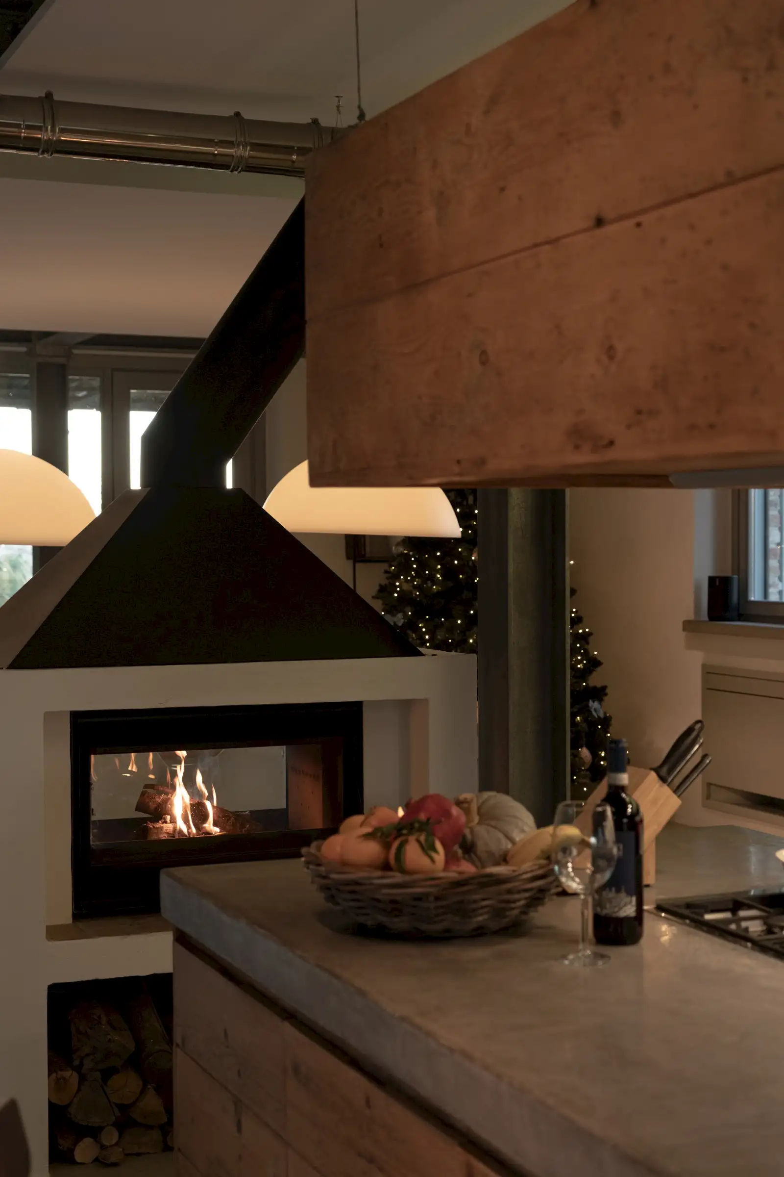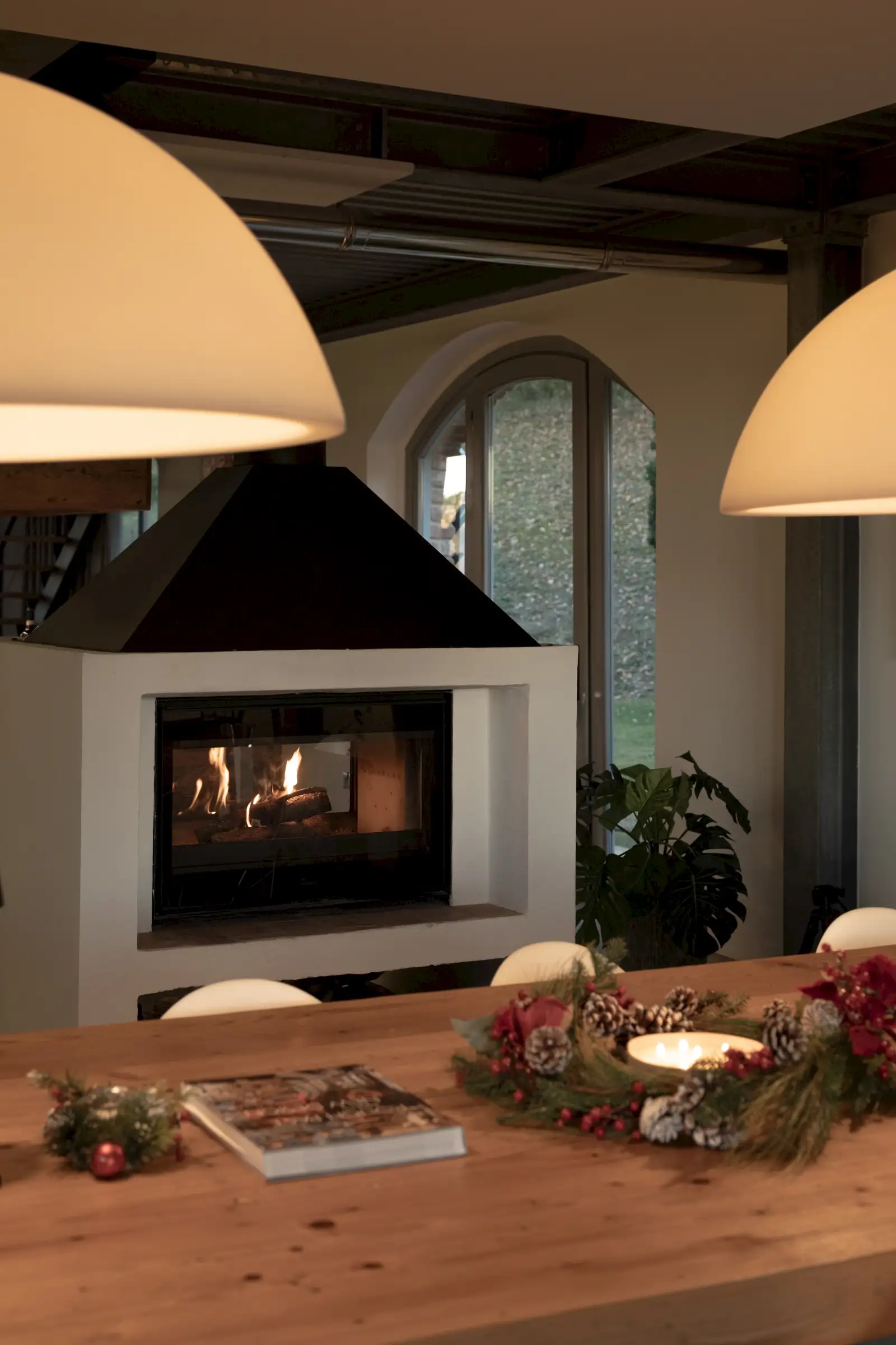 The 100sqm living space is on the ground floor and has double doors to the garden at either end. A high-spec kitchen handcrafted in old wood sits in the middle, with a double-sided fireplace through to the large dining area on one side, and a spacious sitting room at the other end.