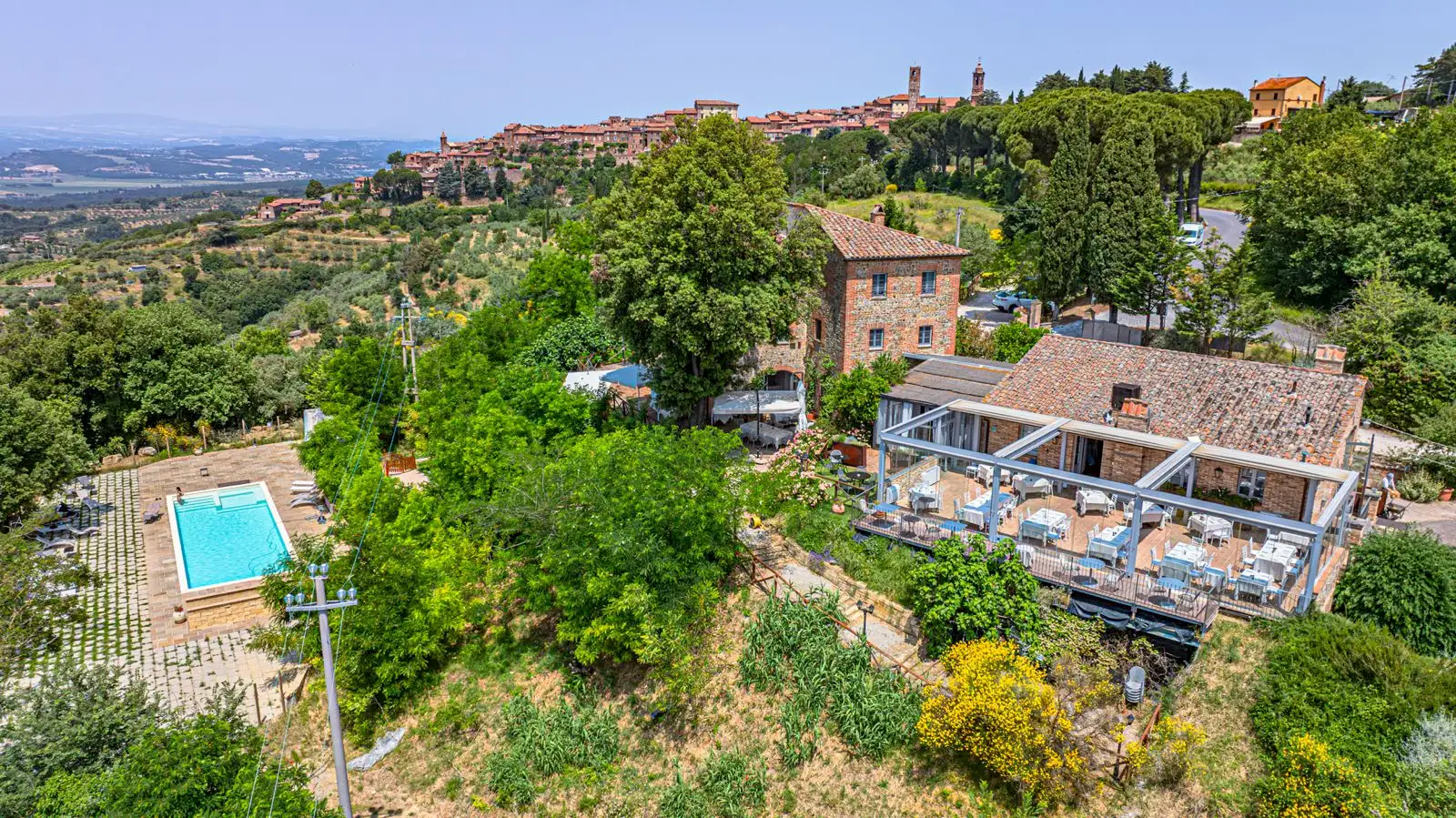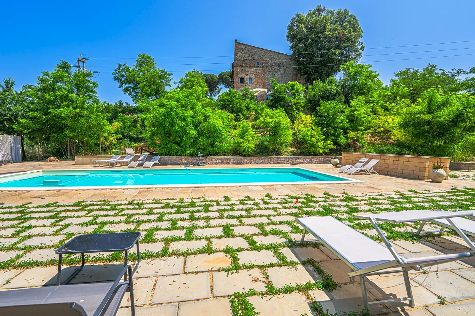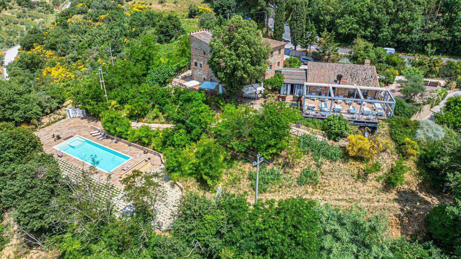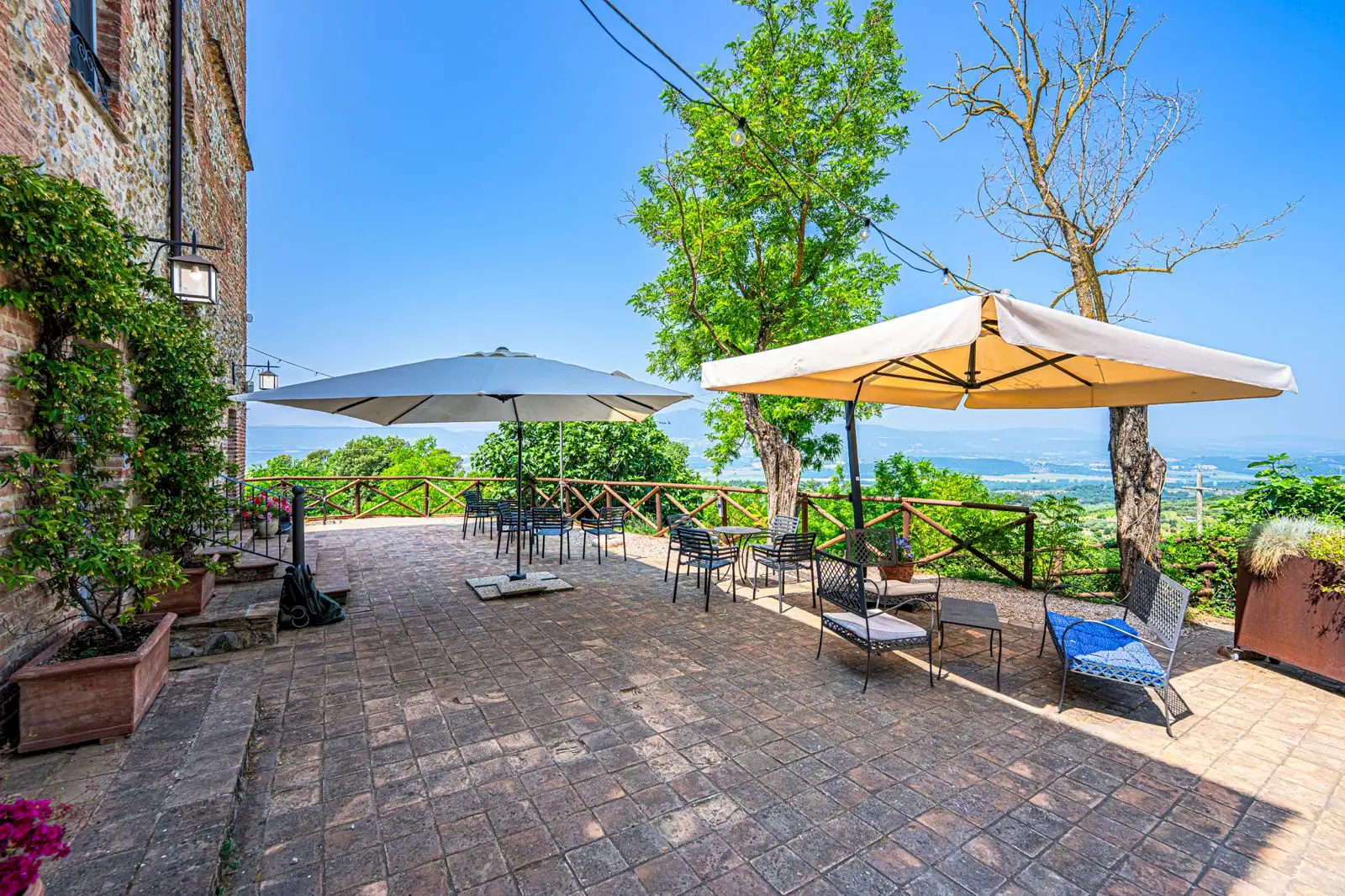 The refined use of terracotta as a prized material for all indoor and outdoor flooring, modern bathrooms, spacious rooms, simple yet elegant furnishings, and the breathtaking views of the Val di Chiana — enjoyable not only from the terrace but also from the splendid swimming pool—make this property truly unique, located only 700 meters from the historic center.