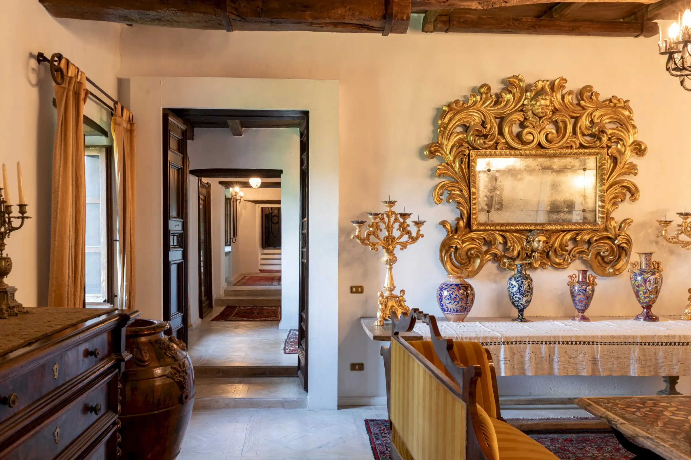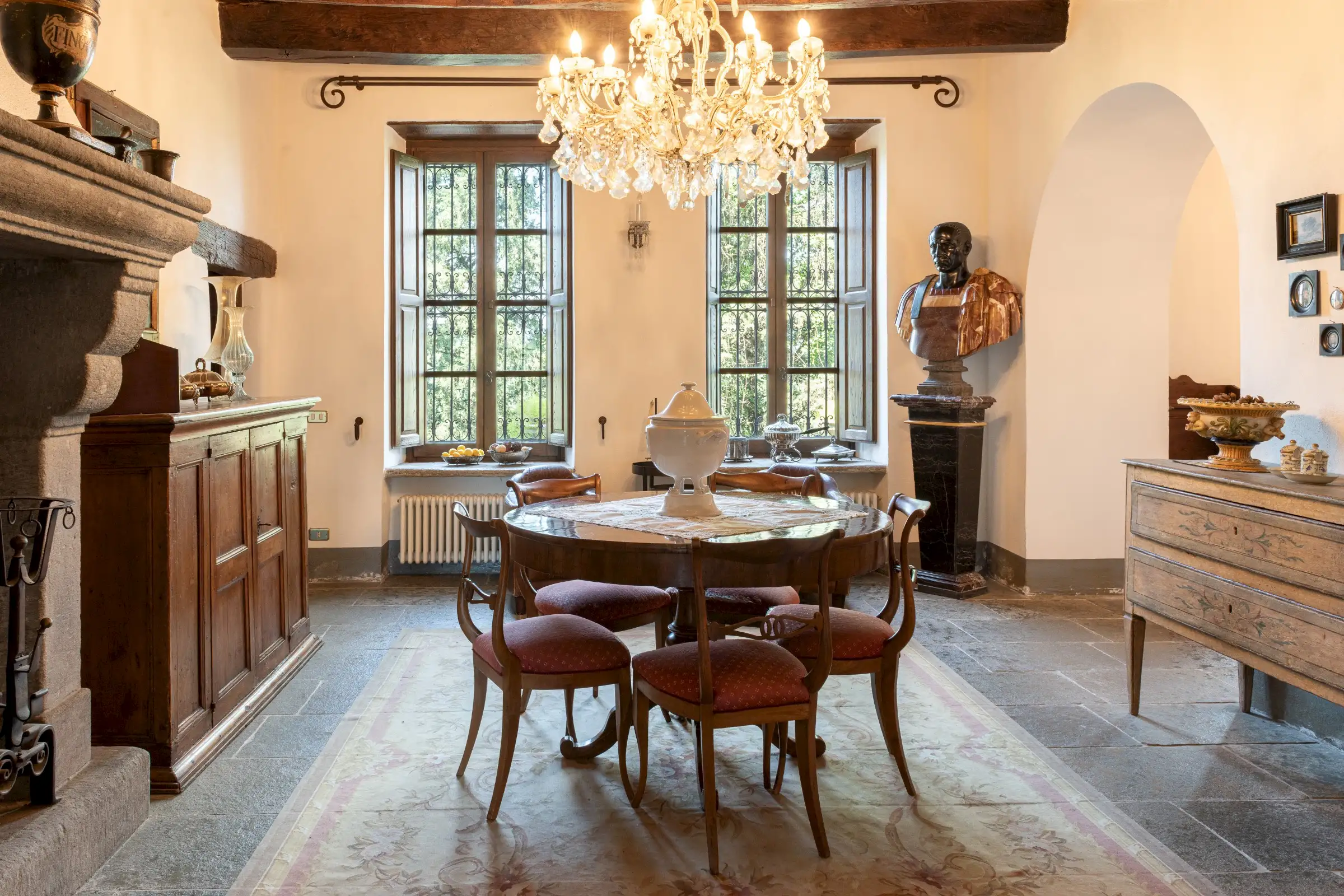 The estate marries traditional character with contemporary comfort: there are six gas boilers (two per floor), an antique wood-burning stove, and six working fireplaces. Every door, coffered wooden ceiling, and terracotta tile is authentic, while fitted wardrobes incorporate genuine 16th- and 17th-century cabinetry. Flooring varies by room—basalt stone on the ground floor (with terracotta tiles in the TV room, larder, and one winter garden salon), antique parquet on the first floor (with stone-tiled baths), and a mix of all three on the top floor and in the tower—underscoring the property’s timeless elegance.