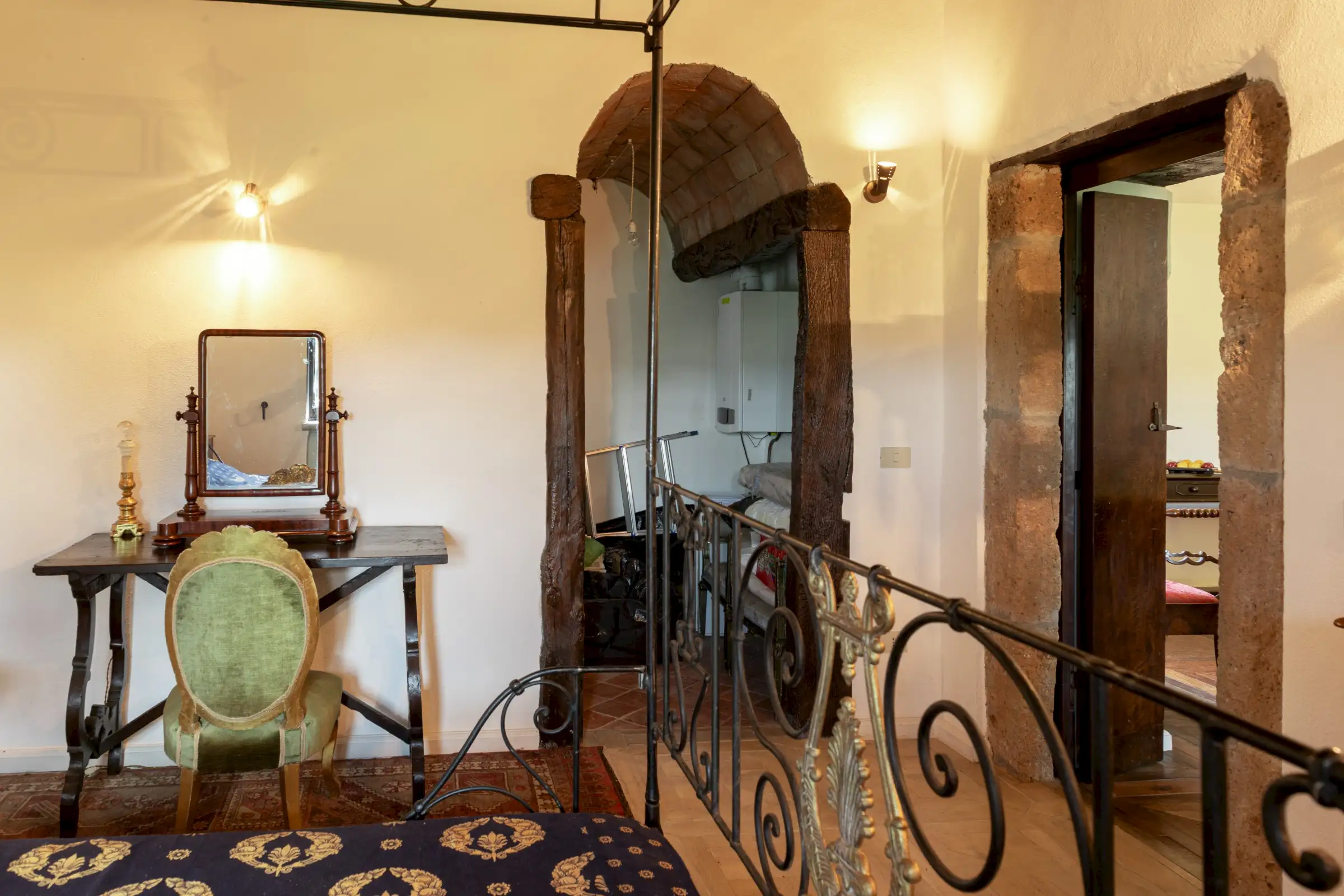 Inside, the main house has been meticulously restored using authentic materials and maintaining period details, including ancient wooden beams, basalt-stone floors, terracotta tiles and pebble mosaics in the winter garden salons, coffered wooden ceilings, antique doors, and built‐in wardrobes crafted from reclaimed 17th-century cabinetry. Six LPG boilers (two per floor), a wood-burning stove and six working fireplaces ensure warmth and comfort throughout.