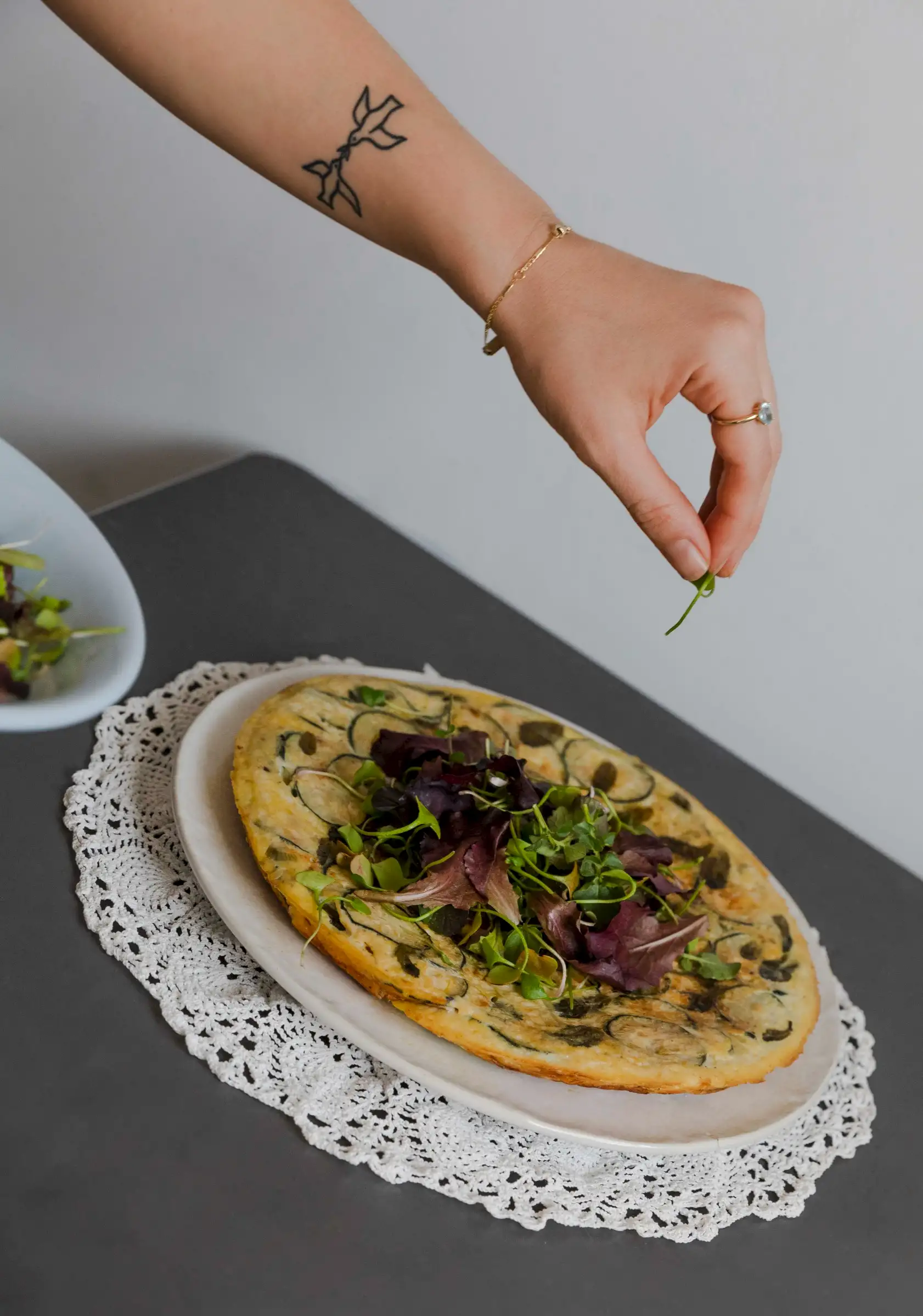 Finish the frittata with a handful of fresh leafy greens of your choice. Let it cool slightly before slicing. Serve warm or at room temperature.
